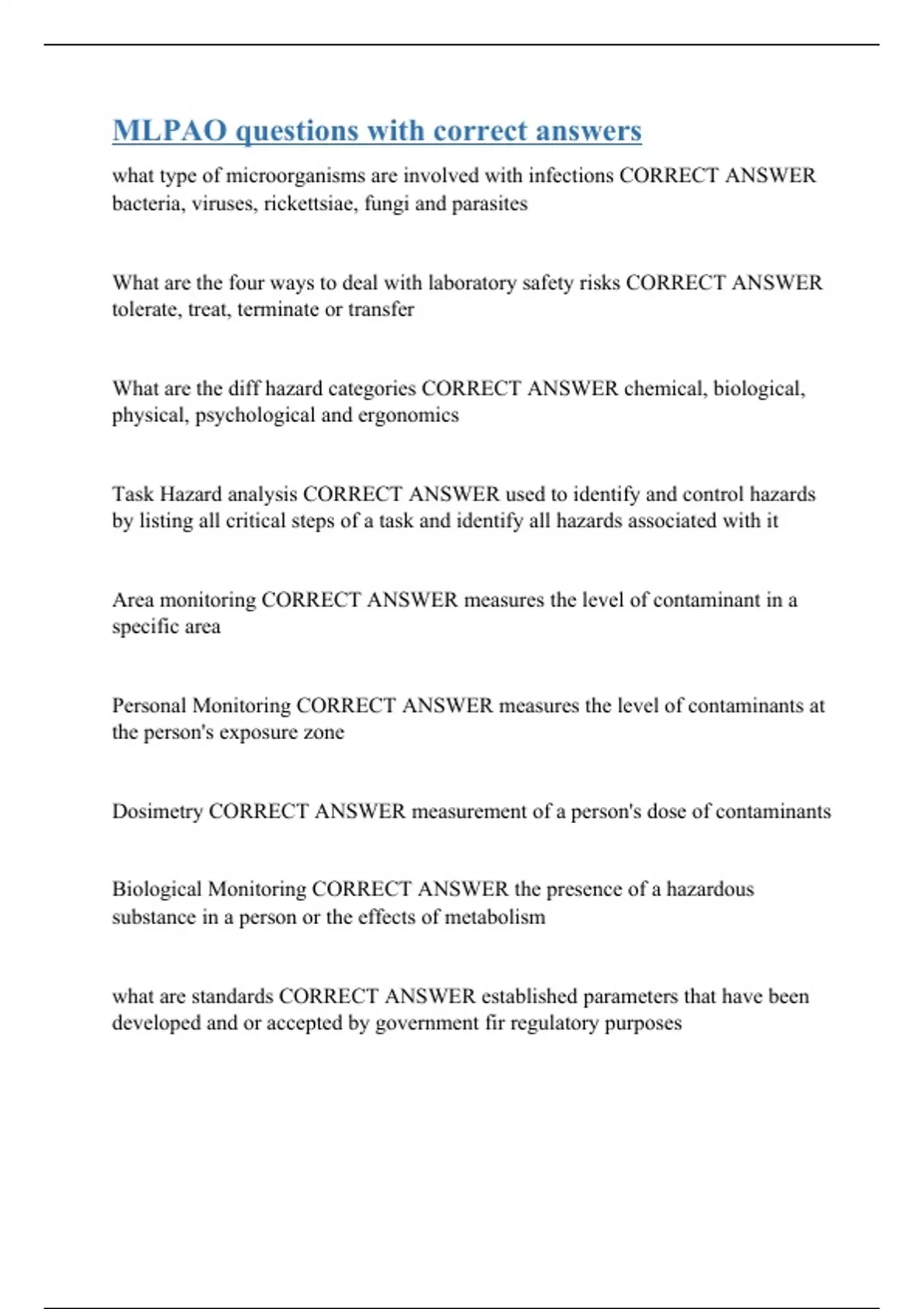 what type of microorganisms are involved with infections CORRECT ANSWER bacteria, viruses, rickettsiae, fungi and parasites What are the four ways to deal with laboratory safety risks CORRECT ANSWER tolerate, treat, terminate or transfer What are the diff hazard categories CORRECT ANSWER chemical, biological, physical, psychological and ergonomics Task Hazard analysis CORRECT ANSWER used to identify and control hazards by listing all critical steps of a task and identify all hazards associated with it Area monitoring CORRECT ANSWER measures the level of contaminant in a specific area Personal Monitoring CORRECT ANSWER measures the level of contaminants at the person's exposure zone Dosimetry CORRECT ANSWER measurement of a person's dose of contaminants Biological Monitoring CORRECT ANSWER the presence of a hazardous substance in a person or the effects of metabolism what are standards CORRECT ANSWER established parameters that have been developed and or accepted by government fir regulatory purposes
