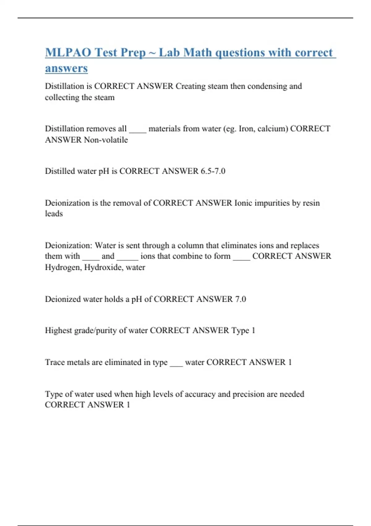 Distillation is CORRECT ANSWER Creating steam then condensing and collecting the steam Distillation removes all ____ materials from water (eg. Iron, calcium) CORRECT ANSWER Non-volatile Distilled water pH is CORRECT ANSWER 6.5-7.0 Deionization is the removal of CORRECT ANSWER Ionic impurities by resin leads Deionization: Water is sent through a column that eliminates ions and replaces them with ____ and _____ ions that combine to form ____ CORRECT ANSWER Hydrogen, Hydroxide, water Deionized water holds a pH of CORRECT ANSWER 7.0 Highest grade/purity of water CORRECT ANSWER Type 1 Trace metals are eliminated in type ___ water CORRECT ANSWER 1 Type of water used when high levels of accuracy and precision are needed CORRECT ANSWER 1