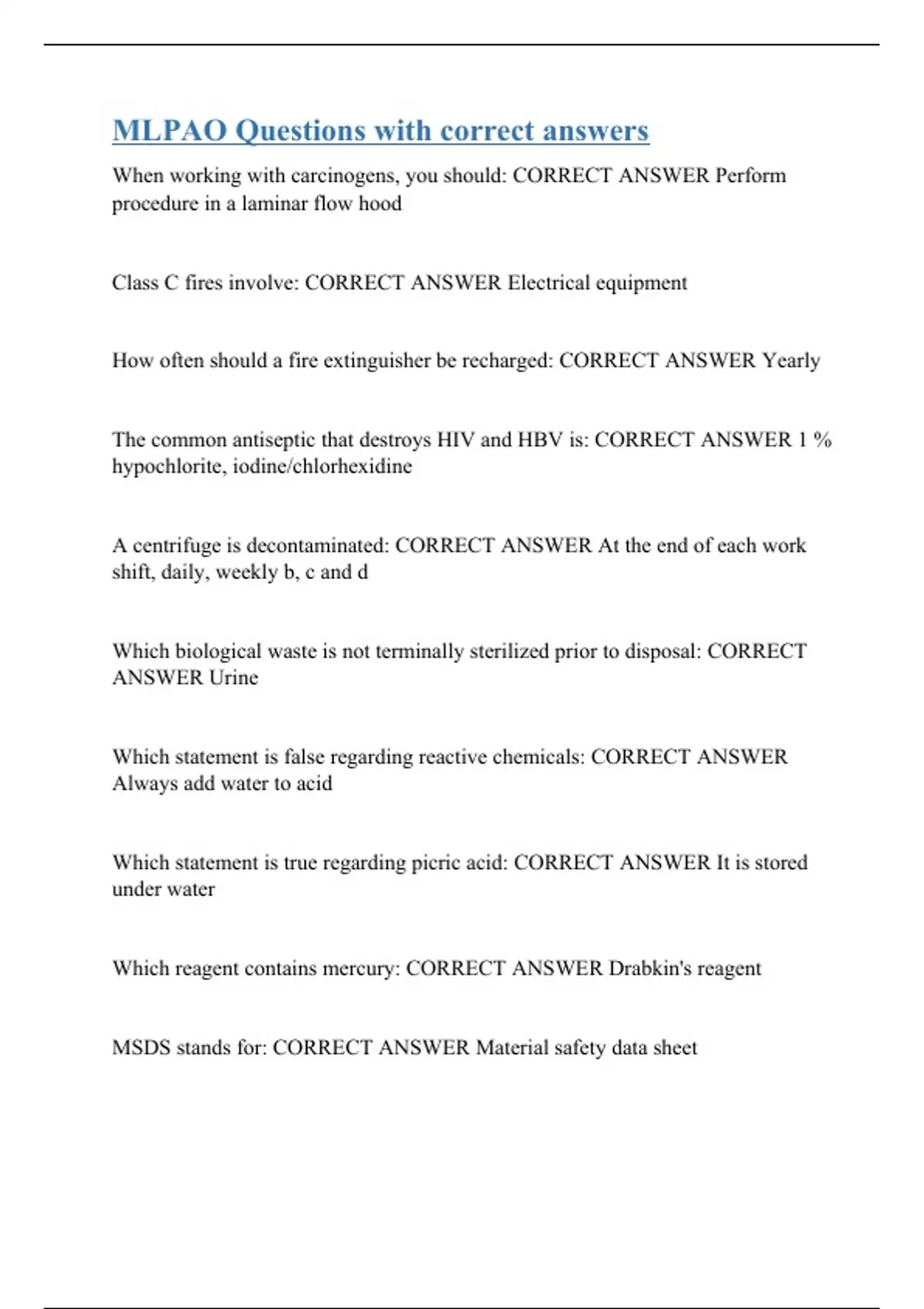 When working with carcinogens, you should: CORRECT ANSWER Perform procedure in a laminar flow hood Class C fires involve: CORRECT ANSWER Electrical equipment How often should a fire extinguisher be recharged: CORRECT ANSWER Yearly The common antiseptic that destroys HIV and HBV is: CORRECT ANSWER 1 % hypochlorite, iodine/chlorhexidine A centrifuge is decontaminated: CORRECT ANSWER At the end of each work shift, daily, weekly b, c and d Which biological waste is not terminally sterilized prior to disposal: CORRECT ANSWER Urine Which statement is false regarding reactive chemicals: CORRECT ANSWER Always add water to acid Which statement is true regarding picric acid: CORRECT ANSWER It is stored under water Which reagent contains mercury: CORRECT ANSWER Drabkin's reagent MSDS stands for: CORRECT ANSWER Material safety data sheet