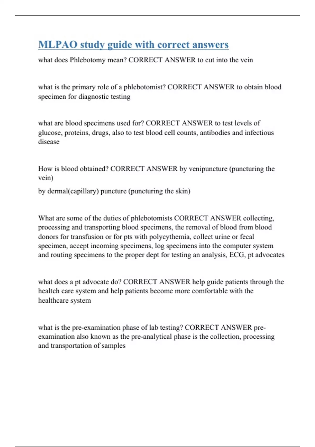 what does Phlebotomy mean? CORRECT ANSWER to cut into the vein what is the primary role of a phlebotomist? CORRECT ANSWER to obtain blood specimen for diagnostic testing what are blood specimens used for? CORRECT ANSWER to test levels of glucose, proteins, drugs, also to test blood cell counts, antibodies and infectious disease How is blood obtained? CORRECT ANSWER by venipuncture (puncturing the vein) by dermal(capillary) puncture (puncturing the skin) What are some of the duties of phlebotomists CORRECT ANSWER collecting, processing and transporting blood specimens, the removal of blood from blood donors for transfusion or for pts with polycythemia, collect urine or fecal specimen, accept incoming specimens, log specimens into the computer system and routing specimens to the proper dept for testing an analysis, ECG, pt advocates what does a pt advocate do? CORRECT ANSWER help guide patients through the healtch care system and help patients become more comfortable with the healthcare system what is the pre-examination phase of lab testing? CORRECT ANSWER pre-examination also known as the pre-analytical phase is the collection, processing and transportation of samples