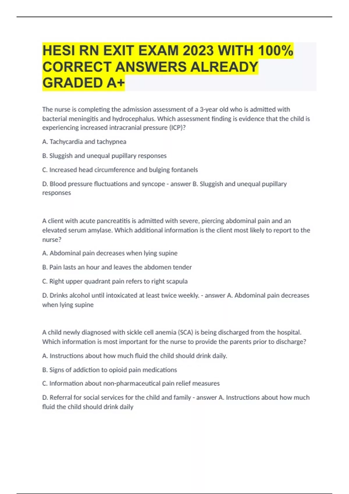 HESI RN EXIT EXAM 2023 WITH 100% CORRECT ANSWERS ALREADY GRADED A+