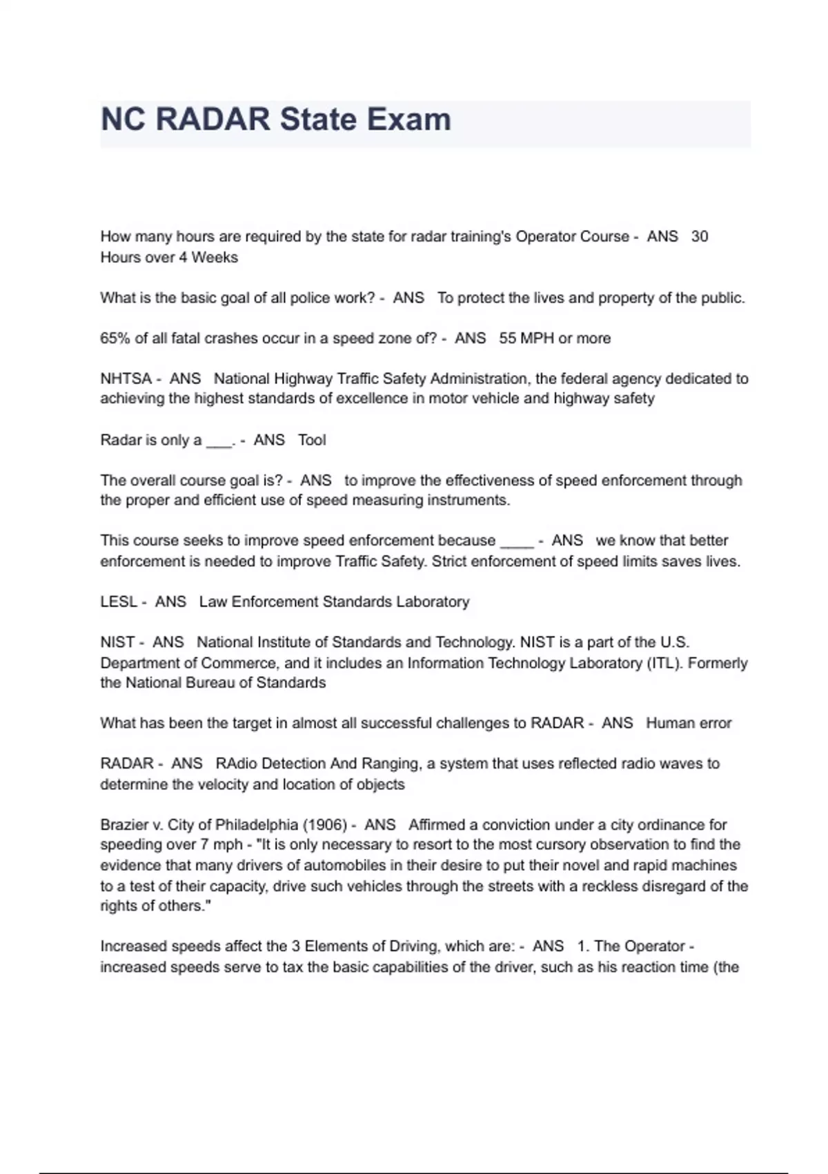 NC RADAR State Exam Questions And Answers How many hours are required by the state for radar training's Operator Course - ANS 30 Hours over 4 Weeks What is the basic goal of all police work? - ANS To protect the lives and property of the public. 65% of all fatal crashes occur in a speed zone of? - ANS 55 MPH or more NHTSA - ANS National Highway Traffic Safety Administration, the federal agency dedicated to achieving the highest standards of excellence in motor vehicle and highway safety Radar is only a ___. - ANS Tool The overall course goal is? - ANS to improve the effectiveness of speed enforcement through the proper and efficient use of speed measuring instruments. This course seeks to improve speed enforcement because ____ - ANS we know that better enforcement is needed to improve Traffic Safety. Strict enforcement of speed limits saves lives. LESL - ANS Law Enforcement Standards Laboratory NIST - ANS National Institute of Standards and Technology. NIST is a part of the U.S. Department of Commerce, and it includes an Information Technology Laboratory (ITL). Formerly the National Bureau of Standards What has been the target in almost all successful challenges to RADAR - ANS Human error RADAR - ANS RAdio Detection And Ranging, a system that uses reflected radio waves to determine the velocity and location of objects Brazier v. City of Philadelphia (1906) - ANS Affirmed a conviction under a city ordinance for speeding over 7 mph - "It is only necessary to resort to the most cursory observation to find the evidence that many drivers of automobiles in their desire to put their novel and rapid machines to a test of their capacity, drive such vehicles through the streets with a reckless disregard of the rights of others." Increased speeds affect the 3 Elements of Driving, which are: - ANS 1. The Operator - increased speeds serve to tax the basic capabilities of the driver, such as his reaction time (the time required to respond to a situation) as well as amplifying any existing physical deficiencies, such as vision 2. The Vehicle - increased speeds tax the automobile equipment, the brakes, steering, etc. 3. The Road Surface - increased speeds amplify the potential hazards of any deficiencies in the road surface (potholes, construction, etc.) or situational conditions resulting from weather, ice, snow, or rain At a speed of 20 MPH, what is the stopping distance? - ANS Reaction Time Distance = 22ft Braking distance = 20 ft. Stopping distance = 22ft + 20ft = 42 ft At a speed of 40 MPH, what is the stopping distance? - ANS Reaction Time Distance = 44 ft Braking distance = 81 ft Stopping distance = 44ft + 81 ft = 125 ft *Note* the braking distance is 4 times that of 20 mph