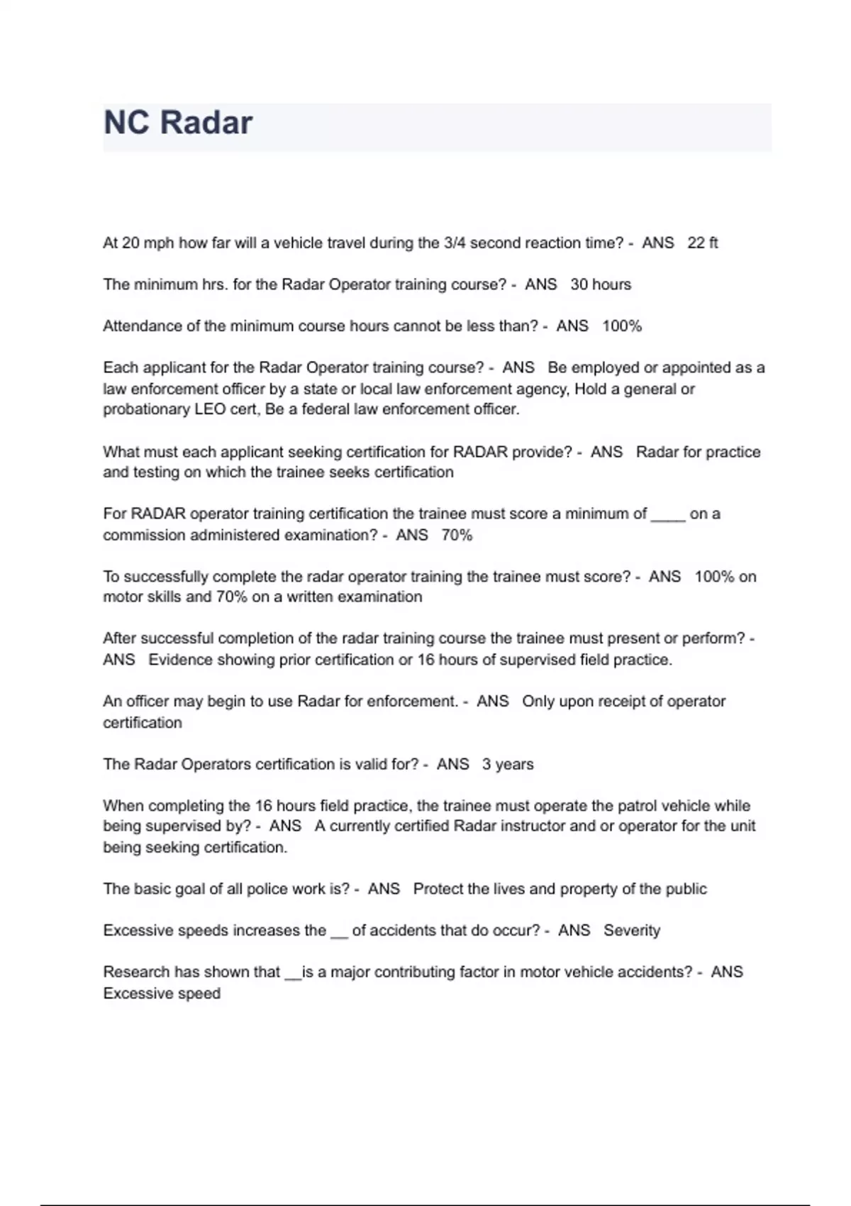 NC Radar Exam Questions And Answers At 20 mph how far will a vehicle travel during the 3/4 second reaction time? - ANS 22 ft The minimum hrs. for the Radar Operator training course? - ANS 30 hours Attendance of the minimum course hours cannot be less than? - ANS 100% Each applicant for the Radar Operator training course? - ANS Be employed or appointed as a law enforcement officer by a state or local law enforcement agency, Hold a general or probationary LEO cert, Be a federal law enforcement officer. What must each applicant seeking certification for RADAR provide? - ANS Radar for practice and testing on which the trainee seeks certification For RADAR operator training certification the trainee must score a minimum of ____ on a commission administered examination? - ANS 70% To successfully complete the radar operator training the trainee must score? - ANS 100% on motor skills and 70% on a written examination After successful completion of the radar training course the trainee must present or perform? - ANS Evidence showing prior certification or 16 hours of supervised field practice. An officer may begin to use Radar for enforcement. - ANS Only upon receipt of operator certification The Radar Operators certification is valid for? - ANS 3 years When completing the 16 hours field practice, the trainee must operate the patrol vehicle while being supervised by? - ANS A currently certified Radar instructor and or operator for the unit being seeking certification. The basic goal of all police work is? - ANS Protect the lives and property of the public Excessive speeds increases the __ of accidents that do occur? - ANS Severity Research has shown that __is a major contributing factor in motor vehicle accidents? - ANS Excessive speed Radar is only a? - ANS Tool Learning how to operate radar is important but it is not our basic goal. We are concerned primarily with? - ANS Speed enforcement The overall course goal is to? - ANS Improve effectiveness of speed enforcement through the proper and efficient use of speed measuring instruments. Which court used the phrase "with a reckless disregard of the right of others? - ANS Brazier v. City of Philadelphia Increased speeds affect the three elements of driving? - ANS Operator, vehicle, and road What is the average reaction time of a person? - ANS 3/4 a second The braking distance at 40 MPH is not twice the distance required at 20 MPH but __ , and the braking distance at 80 MPH is not __ the distance required at 20 MPH but more than __? - ANS 4 times, 4 times, and 16 times What speed law states reasonable and prudent under the existing conditions? - ANS Basic speed law Loosely translated, the term "prima facie" means? - ANS "At first sight" The State of North Carolina has no? - ANS Prima facie speed law Speed limits which simply prohibit driving faster than a specified numeric speed, is known as an __speed law? - ANS Absolute