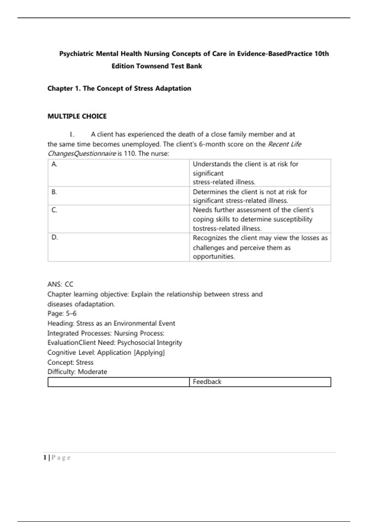 Test Bank Psychiatric Mental Health Nursing Concepts of Care in Evidence-BasedPractice 10th Edition TownsendChapter 1. The Concept of Stress Adaptation MULTIPLE CHOICE 1. A client has experienced the death of a close family member and at the same time becomes unemployed. The client’s 6-month score on the Recent Life Changes Questionnaire is 110. The nurse: A. Understands the client is at risk for significant stress-related illness. B. C. D. Determines the client is not at risk for significant stress-related illness. Needs further assessment of the client’s coping skills to determine susceptibility to stress-related illness. Recognizes the client may view the losses as challenges and perceive them as opportunities. ANS: C C Chapter learning objective: Explain the relationship between stress and diseases of adaptation. Page: 5–6 Heading: Stress as an Environmental Event Integrated Processes: Nursing Process: Evaluation Client Need: Psychosocial Integrity Cognitive Level: Application [Applying] Concept: Stress Difficulty: Moderate Feedback 1 | P a g eA This is incorrect. Assessment is the first step of the nursing process. The nurse should assess the client’s coping skills and available support before determining susceptibility to stress-related physical and psychological illness. The Recent Life Changes Questionnaire is an expanded version of the Schedule of Recent Experiences and the Rahe- Holmes Social Readjustment Rating Scale. A 6-month score of 300 or more, or a year-score total of 500 or more, indicates high stress in a client’s life and susceptibility to stress-related illnesses. B This is incorrect. Assessment is the first step in the nursing process. The nurse should assess the client’s coping skills and available support before determining the client’s perception of the current stresses. A 6-month score of 300 or a year-score of 500 or more on the Recent Life Changes Questionnaire indicates high stress in a client’s life and susceptibility to stress- related physical and psychological illness. C This is correct. Assessment is the first step in the nursing process. The nurse should assess the client’s coping skills and available support before determining susceptibility to stress- related physical and psychological illness. A 6-month score of 300 or a year- score of 500 or more indicates high stress in a client’s life and risk for significant stress- related physical and psychological illness. 2 | P a g eD This is incorrect. Assessment is the first step in the nursing process. The nurse should assess the client’s coping skills and available support before determining susceptibility to stress-related illness. A 6- month score of 300 or a year-score of 500 or more on the Recent Life Changes Questionnaire indicates high stress in a client’s life is susceptible to significant stress-related physical and psychological illness. PTS: 1 2. CON: Stress A physically and emotionally healthy client has just been fired. During a routine office visit, he tells the nurse, “Perhaps this was the best thing to happen. Maybe I’ll consider pursuing an art degree.” The nurse determines the client perceives the stressor of his job loss as: A. Irrelevant. B. C. D. Harm/loss. A threat. A challenge. ANS: D Chapter: Chapter 0, The Concept of Stress Adaptation Chapter learning objective: Discuss adaptive coping strategies in the management of stress. Page: 7 Heading: Individual’s Perception of the Event > Primary Appraisal Integrated Processes: Nursing Process: Assessment Client Need: Psychosocial Integrity Cognitive Level: Application [Applying] Concept: Stress Difficulty: Easy Feedback A This is incorrect. The client’s statement indicates he perceives the loss of his job as a challenge and an opportunity for growth. 3 | P a g eB This is incorrect. The client’s statement indicates he perceives the loss of his job as a challenge and an opportunity for growth. C D This is incorrect. The client’s statement indicates he perceives the loss of his job as a challenge and an opportunity for growth. This is correct. The client’s statement indicates he perceives the loss of his job as a challenge and an opportunity for growth. PTS: 1 3. CON: Stress Which client statement alerts the nurse that the client may be responding maladaptively to stress? A. “Avoiding contact with others helps me cope.” 4 | P a g eB. “I really enjoy journaling; it’s my private time.” C. D. “I signed up for a yoga class this week.” “I made an appointment to meet with a therapist.” ANS: A Chapter: Chapter 0, The Concept of Stress Adaptation Chapter learning objective: Discuss adaptive coping strategies in the management of stress. Page: 8–9 Heading: Stress Management Integrated Processes: Nursing Process: Evaluation Client Need: Psychosocial Integrity Cognitive Level: Application [Applying] Concept: Stress Difficulty: Easy Feedback A This is correct. Reliance on social isolation as a coping mechanism is a maladaptive method to relieve stress. It can prevent learning appropriate coping skills and can prevent access to needed support systems. B C D This is incorrect. Journaling is not considered a maladaptive coping method. This is incorrect. Group exercise is not considered a maladaptive coping method. This is incorrect. Seeing a therapist is not considered a maladaptive coping method. PTS: 1 4. CON: Stress A nursing student comes down with a sinus infection toward the end of every semester. Which stage of stress is the student most likely experiencing when this occurs? A. Alarm reaction B. C. D. 5 | P a g e Resistance Exhaustion Fight or flightANS: C Chapter: Chapter 0, The Concept of Stress Adaptation Chapter learning objective: Explain the relationship between stress and diseases of adaptation. Page: 9 Heading: Stress as a Biological Response > Stage of Exhaustion Integrated Processes: Nursing Process: Assessment Client Need: Psychosocial Integrity Cognitive Level: Comprehension [Und