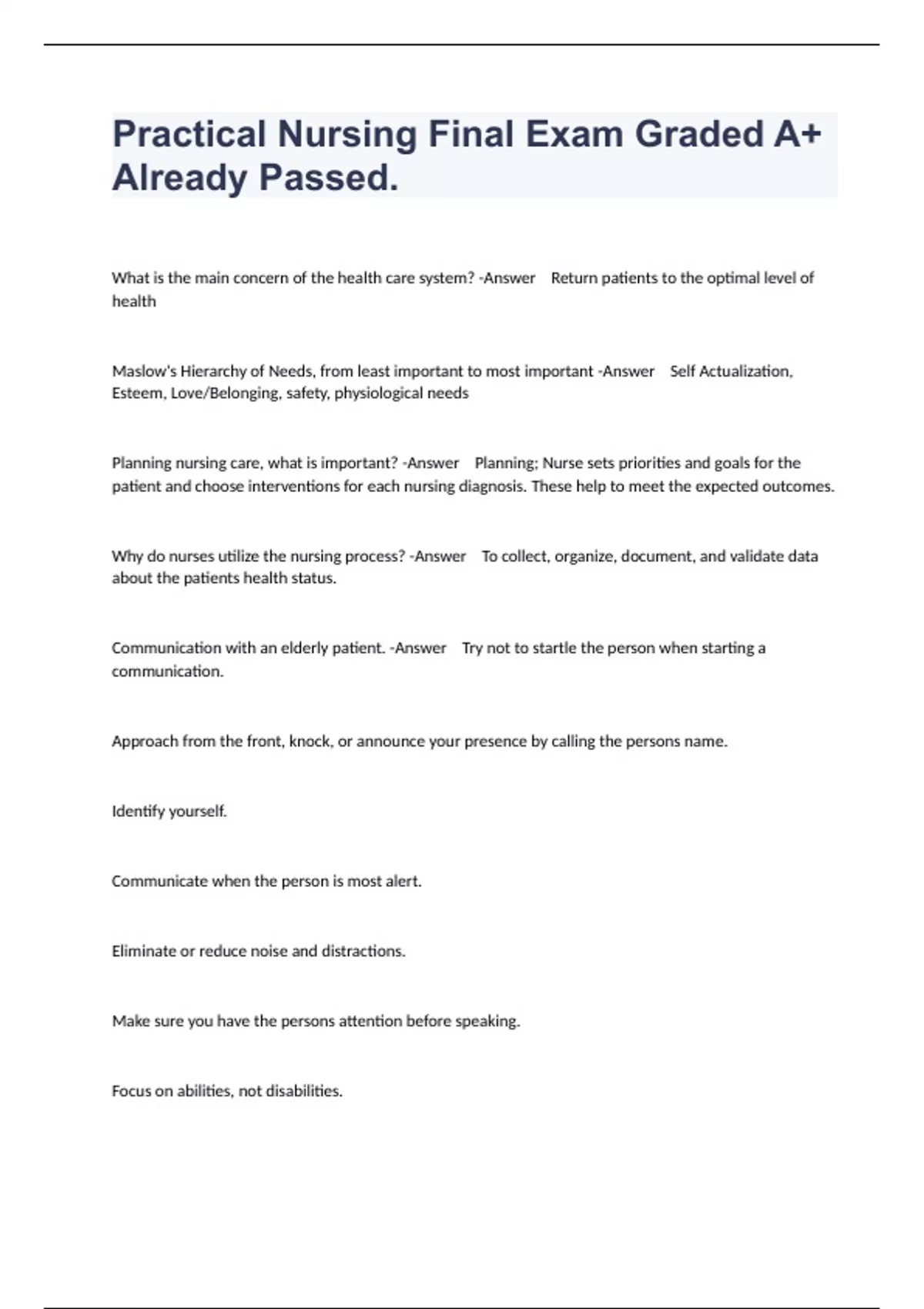 Practical Nursing Final Exam Graded A+ Already Passed.