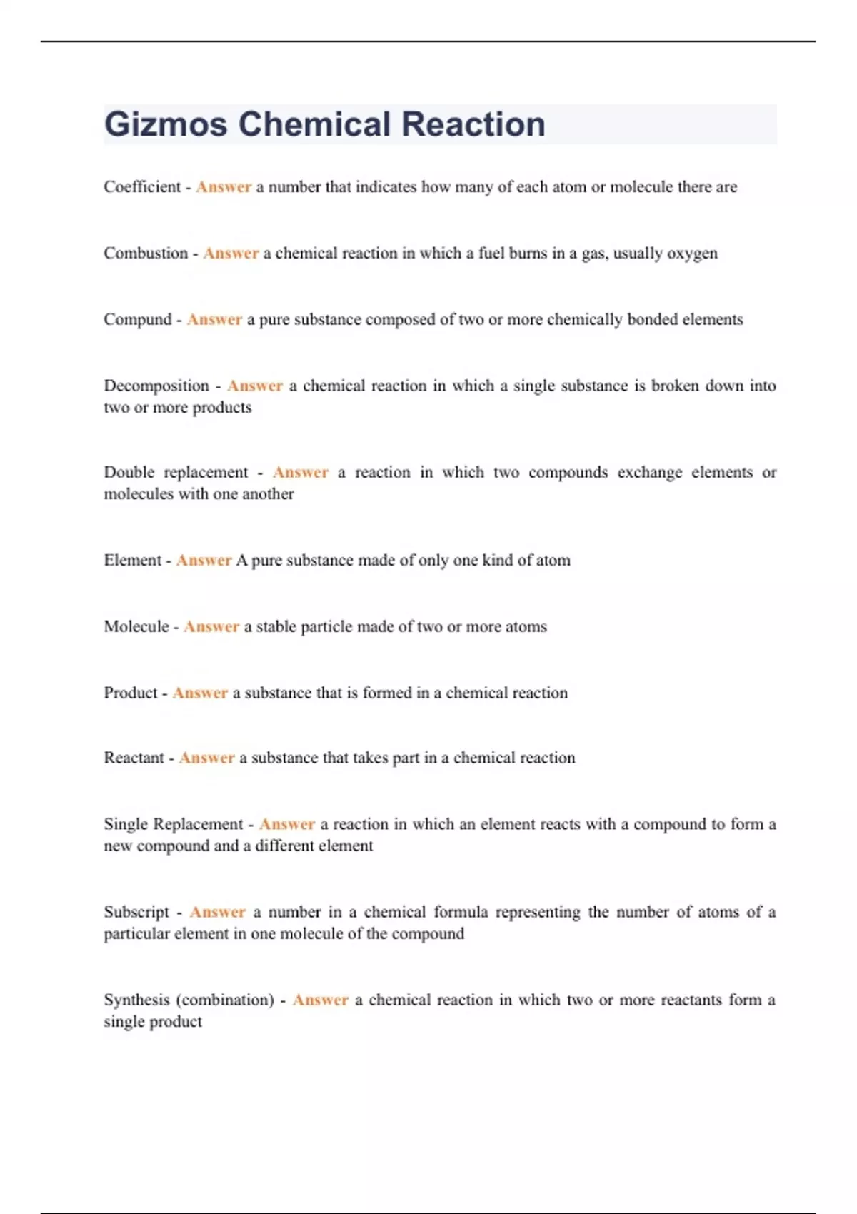 Gizmos Chemical Reaction. Questions and Answers 2023/2024 Coefficient - Answer a number that indicates how many of each atom or molecule there are Combustion - Answer a chemical reaction in which a fuel burns in a gas, usually oxygen Compund - Answer a pure substance composed of two or more chemically bonded elements Decomposition - Answer a chemical reaction in which a single substance is broken down into two or more products Double replacement - Answer a reaction in which two compounds exchange elements or molecules with one another Element - Answer A pure substance made of only one kind of atom Molecule - Answer a stable particle made of two or more atoms Product - Answer a substance that is formed in a chemical reaction