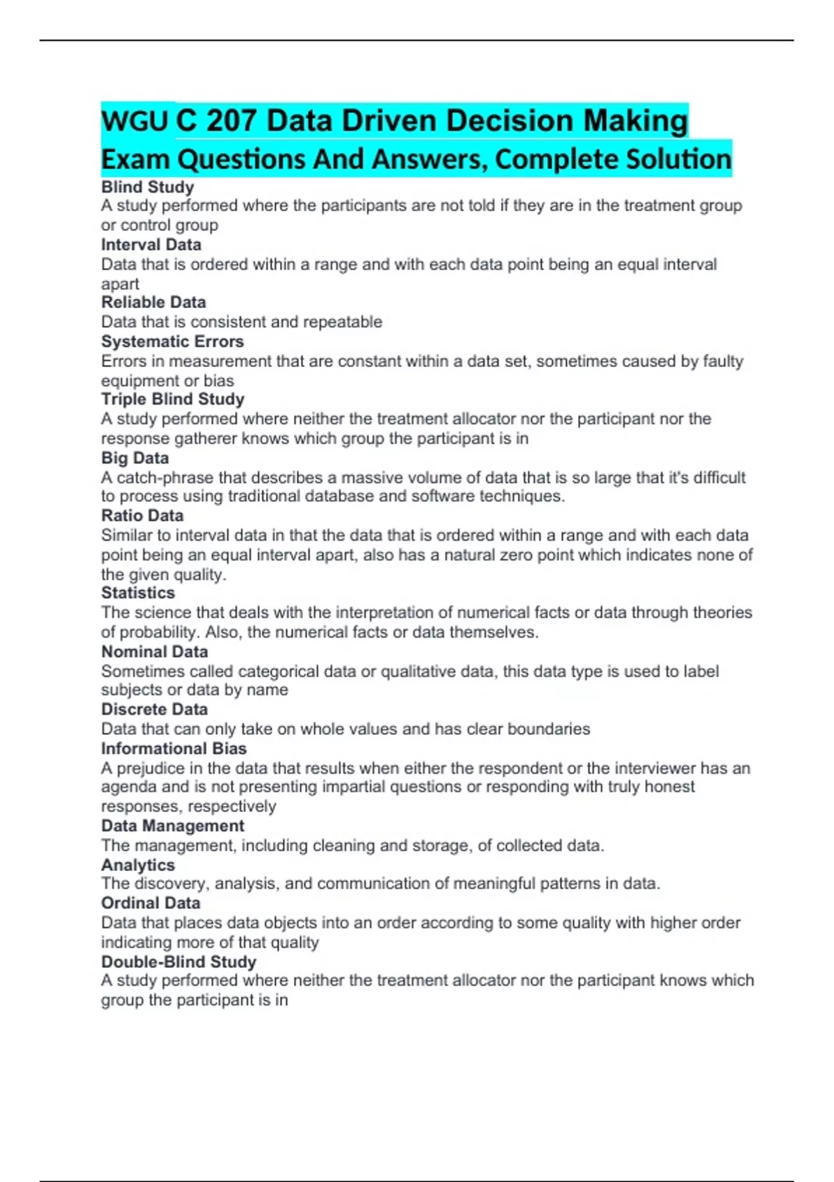 WGU C 207 Data Driven Decision Making Exam Questions And Answers, Complete Solution