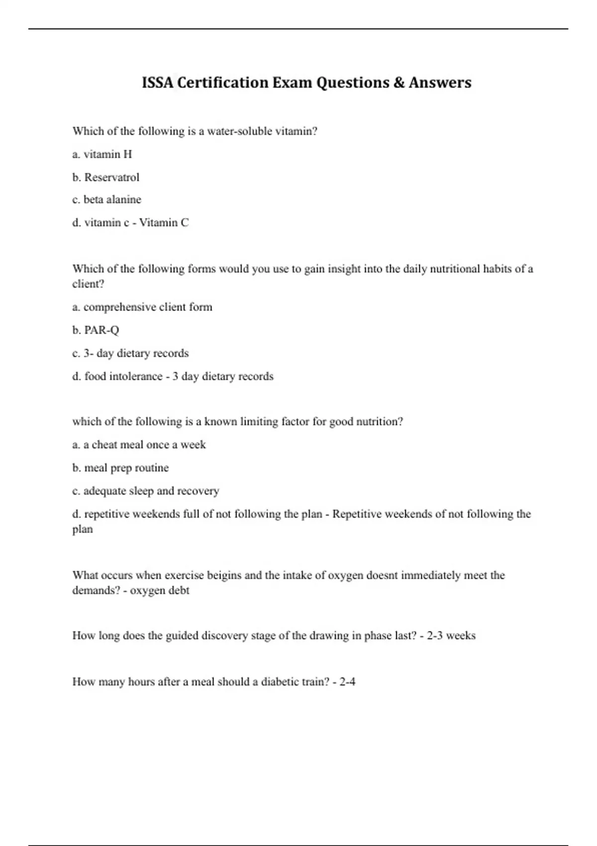 Which of the following is a water-soluble vitamin? a. vitamin H b. Reservatrol c. beta alanine d. vitamin c - Vitamin C Which of the following forms would you use to gain insight into the daily nutritional habits of a client? a. comprehensive client form b. PAR-Q c. 3- day dietary records d. food intolerance - 3 day dietary records which of the following is a known limiting factor for good nutrition? a. a cheat meal once a week b. meal prep routine c. adequate sleep and recovery d. repetitive weekends full of not following the plan - Repetitive weekends of not following the plan What occurs when exercise beigins and the intake of oxygen doesnt immediately meet the demands? - oxygen debt How long does the guided discovery stage of the drawing in phase last? - 2-3 weeks How many hours after a meal should a diabetic train? - 2-4which of the following is an example of polyunsaturated fatty acid? a. Omega 6 b. oleic acid c. amino acids d. Vitamin K - Omega 6 Which of the following stabilizes the knee on the posterior side? Sartorius gracilis hamstrings quadriceps - Hamstrings what amount should a female have of fats per meal? - 1 thumb what special population are emiromental considerations such a pollen, allergies, and extreame temperatures are key to their training plan? - asthmatics which of the following is acceptable body fat range for male? 6-9% 10-14% 15-18% 19-23% - 19-23