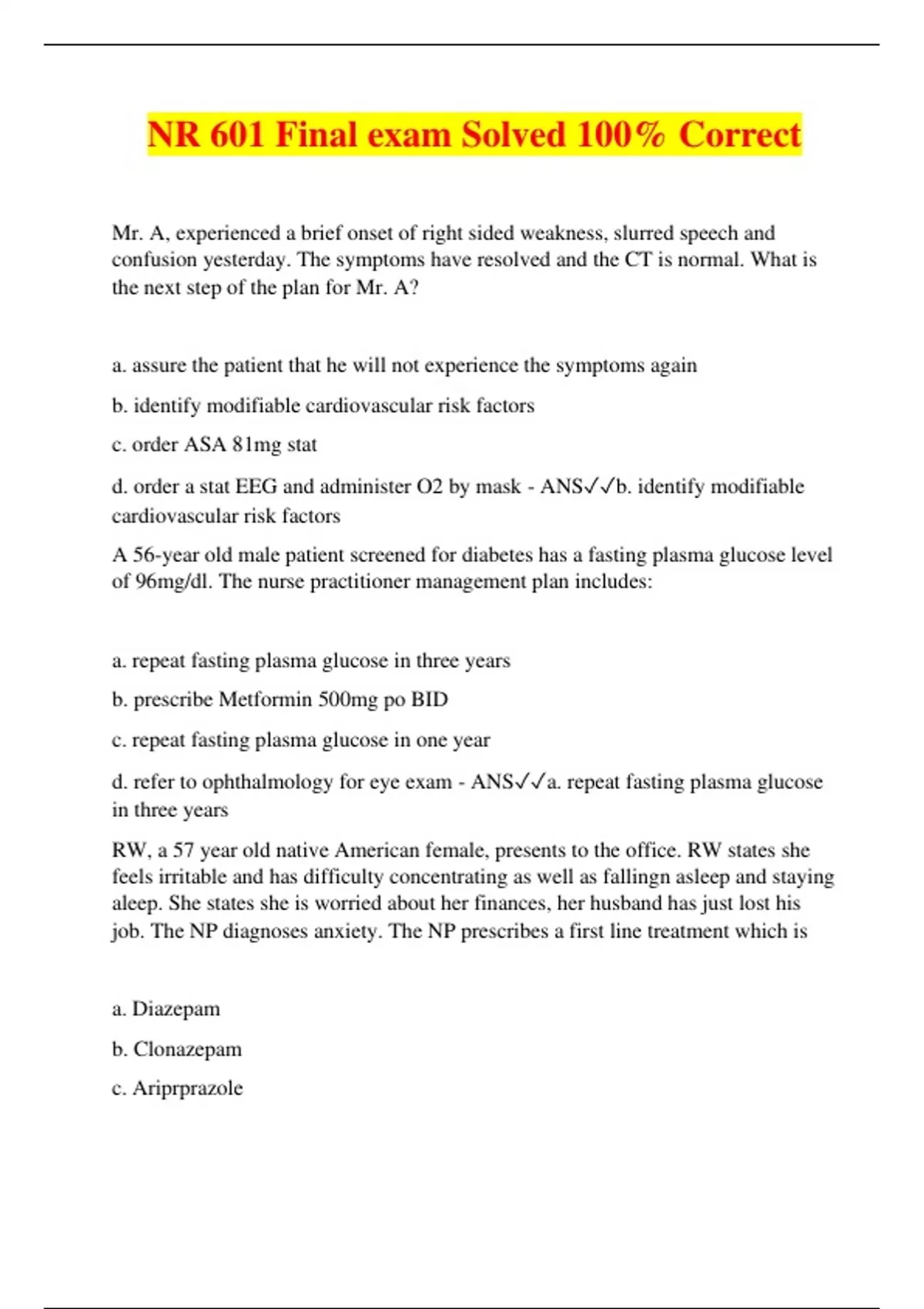 NR 601 Final exam Solved 100% Correct Mr. A, experienced a brief onset of right sided weakness, slurred speech and confusion yesterday. The symptoms have resolved and the CT is normal. What is the next step of the plan for Mr. A? a. assure the patient that he will not experience the symptoms again b. identify modifiable cardiovascular risk factors c. order ASA 81mg stat d. order a stat EEG and administer O2 by mask - ANSb. identify modifiable cardiovascular risk factors A 56-year old male patient screened for diabetes has a fasting plasma glucose level of 96mg/dl. The nurse practitioner management plan includes: a. repeat fasting plasma glucose in three years b. prescribe Metformin 500mg po BID c. repeat fasting plasma glucose in one year d. refer to ophthalmology for eye exam - ANSa. repeat fasting plasma glucose in three years RW, a 57 year old native American female, presents to the office. RW states she feels irritable and has difficulty concentrating as well as fallingn asleep and staying aleep. She states she is worried about her finances, her husband has just lost his job. The NP diagnoses anxiety. The NP prescribes a first line treatment which is a. Diazepam b. Clonazepam c. Ariprprazole d. Paroxetine - ANSd. Paroxetine The most common sustained rhythmic disorder, which consists of fibrillatory p waves is: a. AV block b. atrial tachycardia c. atrial fibrillation d. atrial flutter - ANSc. atrial fibril