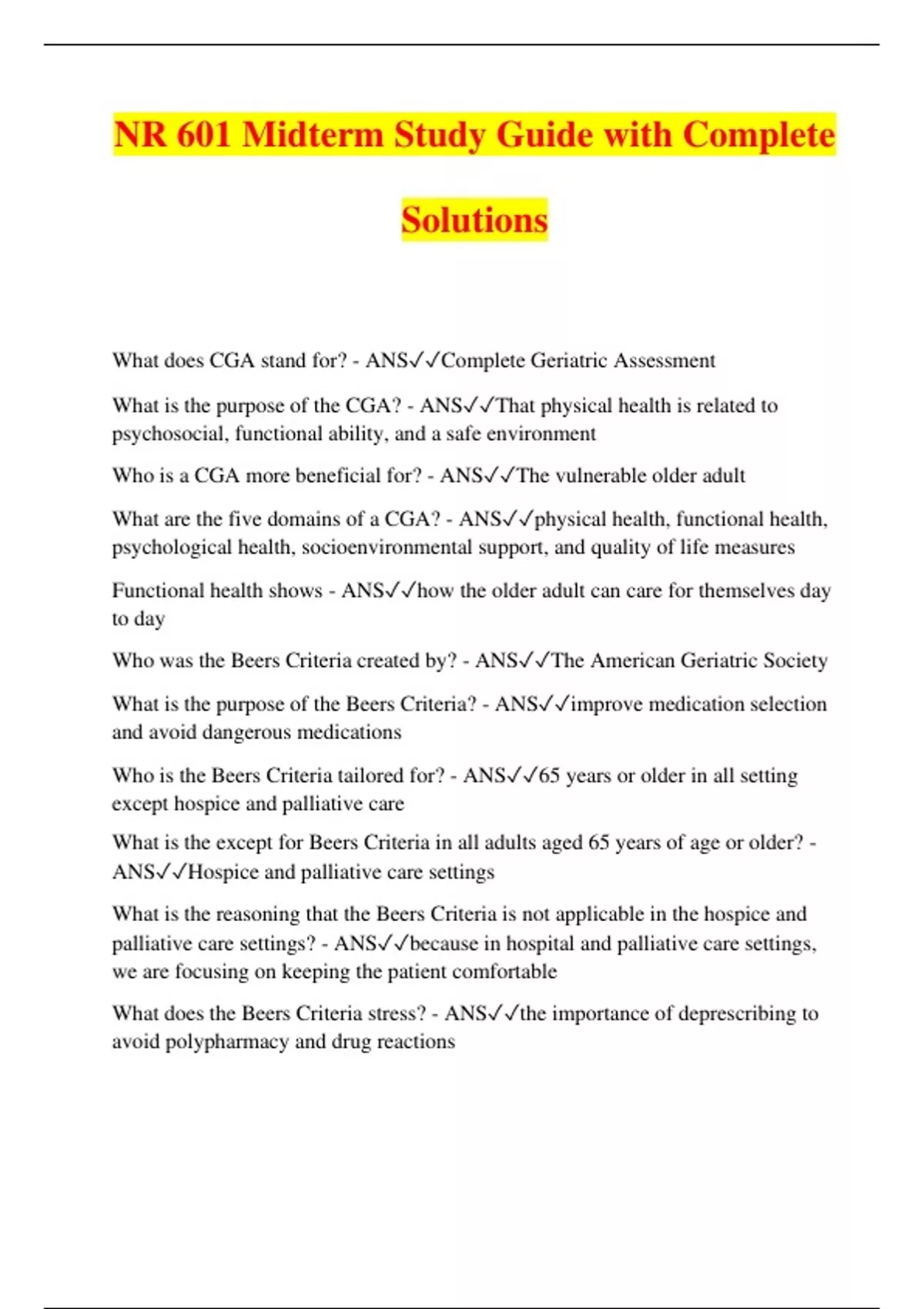 NR 601 Midterm Study Guide with Complete Solutions What does CGA stand for? - ANSComplete Geriatric Assessment What is the purpose of the CGA? - ANSThat physical health is related to psychosocial, functional ability, and a safe environment Who is a CGA more beneficial for? - ANSThe vulnerable older adult What are the five domains of a CGA? - ANSphysical health, functional health, psychological health, socioenvironmental support, and quality of life measures Functional health shows - ANShow the older adult can care for themselves day to day Who was the Beers Criteria created by? - ANSThe American Geriatric Society What is the purpose of the Beers Criteria? - ANSimprove medication selection and avoid dangerous medications Who is the Beers Criteria tailored for? - ANS65 years or older in all setting except hospice and palliative care What is the except for Beers Criteria in all adults aged 65 years of age or older? - ANSHospice and palliative care settings What is the reasoning that the Beers Criteria is not applicable in the hospice and palliative care settings? - ANSbecause in hospital and palliative care settings, we are focusing on keeping the patient comfortable What does the Beers Criteria stress? - ANSthe importance of deprescribing to avoid polypharmacy and drug reaction