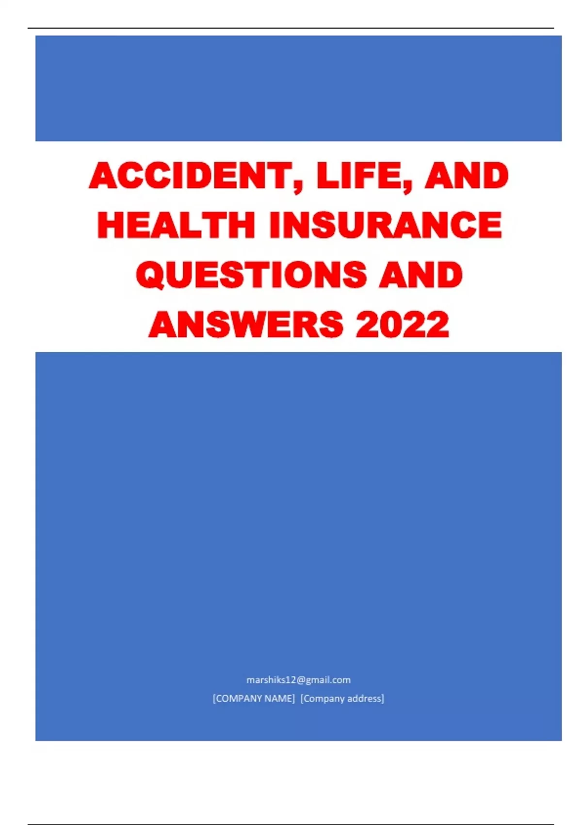 Accident, Life, and Health Insurance questions and answers 2022 Premiums paid by self-employed sole proprietors or partners for medical expense insurance are - answera) Not tax deductible b) Partially tax deductible c) Totally tax deductible d) Taxable c) Totally tax deductible - answerc) What is the purpose of a conditional receipt - answera) It is given by the agent only to applicants who fully prepay all scheduled premiums in advance of policy issue b) It is intended to provide coverage on a date earlier than the date of the issuance of the policy c) It guarantees the applicant that the policy will be issued in the amount applied for in the application d) It serves as proof that the agent has determined the applicant to be fully insurable for coverage by the insurance company b) - answerb) What method is used to determine the taxable portion of each annuity payment? - answera) The excise ratio b) The annuity ratio c) The marginal tax formula d) The exclusion ratio d) - answerd) An insurance producer is also the instructor of a 3-hour ethics course held once a year. To maintain certification, the producer - answera) Must take 24 hours of continuing education courses b) Is not required to take any continuing education courses c) May apply for a continuing education waiver from the Insurance Commissioner d) Must take 18 hours of continuing education courses d) - answerd) What is the tax consequence of amounts received from a Traditional IRA after the money was left in the tax-deferred accounts by the beneficiary? - answera) Capital gains tax on distributions and no penalty b) Capital gains tax on distributions plus 10% penalty c) Income tax on distributions and no penalty d) Income tax on distributions plus 10% penalty c) - answerc) Which of the following is true regarding health insurance underwriting for a person with HIV? - answera) The person may not be declined for medical coverage solely based on HIV status b) A person may be declined for HIV but not AIDS c) The person may be declined d) The person may only be declined if he/she has symptoms a) - answera) Guarantee of insurability option in long-term care policies allows the insured to - answera) Replace the existing LTC policy based on the original underwriting b) Secure the policy's non-forfeiture values regardless of the insured's age or health status c) Increase benefit levels without providing proof of insurability d) Add dependents to the plan without providing proof of their insurability c) - answerc) A prospective insured receives a conditional receipt but dies before the policy is issued. The insurer will - answera) Pay the policy proceeds up to an established limit b) Not pay the policy proceeds under any circumstances c) Automatically pay the policy proceeds d) Pay the policy proceeds only if it would have issued the policy d) - answerd) What provision can reduce the disability benefit based upon the insureds current income? - answera) Pro rata provision b) Rehabilitation benefit c) Relation of earnings to insurance d) Waiver of monthly premium c) - answerc) An applicant is considered to be high-risk but not so much that the insurer wants to deny coverage. Which of the following is NOT true? - answera) The insurer will issue conditional coverage b) The insurer can increase the premium c) The insurer can add exclusions to the policy d) The insurer can rate-up the policy a) - answera) As it pertains to group health insurance, COBRA stipulates that - answera) Retiring employees must be allowed to convert their group coverage to individual policies b) Terminated employees must be allowed to convert their group coverage to individual policies c) Group coverage must be extended for terminated employees up to a certain period of time at the employers expense d) Group coverage must be extended for terminated employees up to a certain period of time at the former employees expense d) - answerd) In comparison to consumer reports, which of the following describes a unique characteristic of investigative consumer reports? - answera) The customer has no knowledge of this action b) The customer's associates, friends, and neighbors provide the reports data c) They provide additional information from an outside source about a particular risk d) They provide information about a customer's character and reputation b) - answerb) Premium payments for personally-owned disability income policies are - answera) Not tax deductible b) Eligible for tax credits c) Tax deductible d) Tax deductible to the extent that they exceed 10% of the adjusted gross income of those itemizing deductions a) - answera) What is the advantage of having a qualified annuity? - answera) Receiving a lump-sum settlement tax free b) Higher dividends c) Favorable tax treatment d) No filling with the IRS c) - answerc) If an insurance company makes a statement that its policies are guaranteed by the existence of the Insurance Guaranty Association - answera) A misrepresentation b) An accurate statement c) A legal representation of the Association d) An unfair trade practice d) - answerd) The Federal Fair Credit Reporting Act - answera) Prevents money laundering b) Regulates consumer reports c) Protects customer privacy d) Regulates telemarketing b) - answerb) An insured has medical insurance coverage through 2 different providers, both covering the same expenses on an expense-incurred basis. Neither company knows in advance that the insured has coverage through any other insurers. The insured submits a claim to both insurers. How should the claim be handled? - answera) Each insurer should pay a proportionate amount of the claim b) One of the insurers will pay fully, while the other will not pay any benefits c) Once the insurers discover the duplicate coverage, the policies would most likely be cancelled, and no claim paid. d) The insured should receive full benefits from each insurer. a) - answera) The policyowner wants to make sure that upon his death, the life policy will p