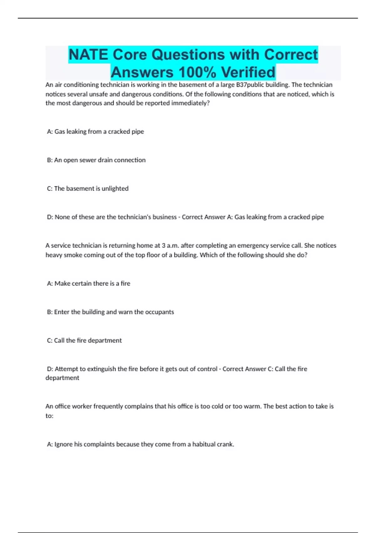NATE Core Questions with Correct Answers 100% Verified An air conditioning technician is working in the basement of a large B37public building. The technician notices several unsafe and dangerous conditions. Of the following conditions that are noticed, which is the most dangerous and should be reported immediately? A: Gas leaking from a cracked pipe B: An open sewer drain connection C: The basement is unlighted D: None of these are the technician's business - Correct Answer A: Gas leaking from a cracked pipe A service technician is returning home at 3 a.m. after completing an emergency service call. She notices heavy smoke coming out of the top floor of a building. Which of the following should she do? A: Make certain there is a fire B: Enter the building and warn the occupants C: Call the fire department D: Attempt to extinguish the fire before it gets out of control - Correct Answer C: Call the fire department An office worker frequently complains that his office is too cold or too warm. The best action to take is to: A: Ignore his complaints because they come from a habitual crank.