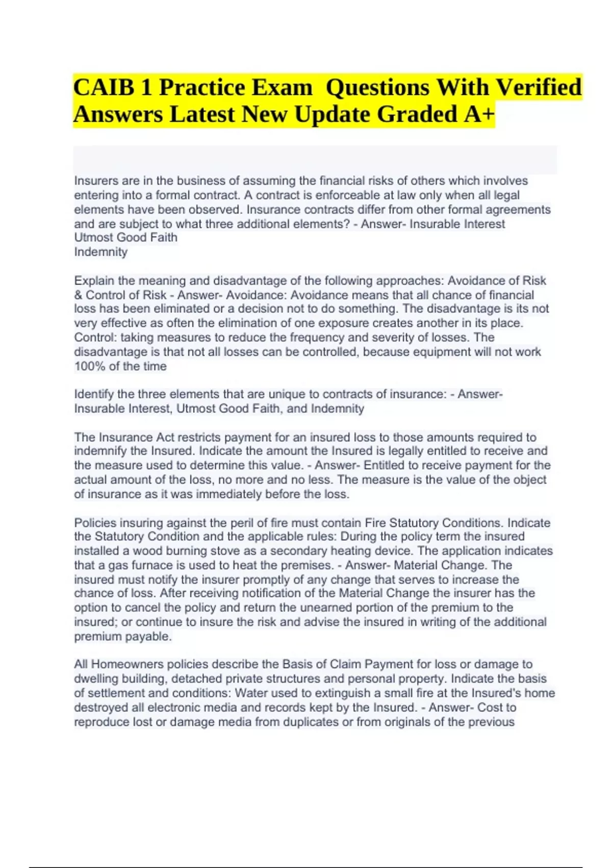 CAIB 1 Practice Exam Questions With Verified Answers Latest New Update 2024 Graded A+. Insurers are in the business of assuming the financial risks of others which involves entering into a formal contract. A contract is enforceable at law only when all legal elements have been observed. Insurance contracts differ from other formal agreements and are subject to what three additional elements? - Answer- Insurable Interest Utmost Good Faith Indemnity Explain the meaning and disadvantage of the following approaches: Avoidance of Risk & Control of Risk - Answer- Avoidance: Avoidance means that all chance of financial loss has been eliminated or a decision not to do something. The disadvantage is its not very effective as often the elimination of one exposure creates another in its place. Control: taking measures to reduce the frequency and severity of losses. The disadvantage is that not all losses can be controlled, because equipment will not work 100% of the time Identify the three elements that are unique to contracts of insurance: - AnswerInsurable Interest, Utmost Good Faith, and Indemnity The Insurance Act restricts payment for an insured loss to those amounts required to indemnify the Insured. Indicate the amount the Insured is legally entitled to receive and the measure used to determine this value. - Answer- Entitled to receive payment for the actual amount of the loss, no more and no less. The measure is the value of the object of insurance as it was immediately before the loss. Policies insuring against the peril of fire must contain Fire Statutory Conditions. Indicate the Statutory Condition and the applicable rules: During the policy term the insured installed a wood burning stove as a secondary heating device. The application indicates that a gas furnace is used to heat the premises. - Answer- Material Change. The insured must notify the insurer promptly of any change that serves to increase the chance of loss. After receiving notification of the Material Change the insurer has the option to cancel the policy and return the unearned portion of the premium to the insured; or continue to insure the risk and advise the insured in writing of the additional premium payable. All Homeowners policies describe the Basis of Claim Payment for loss or damage to dwelling building, detached private structures and personal property. Indicate the basis of settlement and conditions: Water used to extinguish a small fire at the Insured's home destroyed all electronic media and records kept by the Insured. - Answer- Cost to reproduce lost or damage media from duplicates or from originals of the previous CAIB 1 Practice Exam Questions With Verified Answers Latest New Update Graded A+ generation of the media. The payment for lost records is the cost of blank books, pages, cards or other materials plus the cost of actually transcribing or copying such records. Another option for insuring property values under Homeowners policies is the "Single Limit" basis. Explain how this basis differs from the usual coverage format and the advantage that this approach offers: - Answer- Coverages A to D are combined into one single limit. The advantage is that this approach eliminates the coverage restriction otherwise applicable to Coverages B, C and D