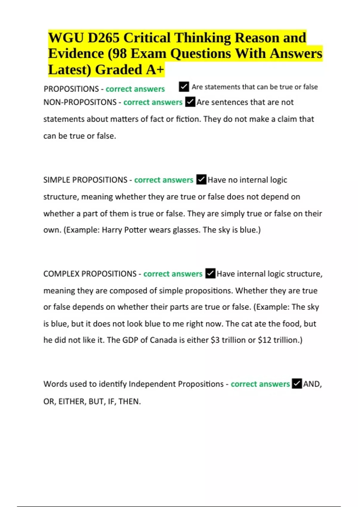 WGU D265 Critical Thinking Reason and Evidence Exam Questions With Answers Latest Graded A+. SIMPLE PROPOSITIONS - correct answers Have no internal logic structure, meaning whether they are true or false does not depend on whether a part of them is true or false. They are simply true or false on their own. (Example: Harry Potter wears glasses. The sky is blue.) COMPLEX PROPOSITIONS - correct answers Have internal logic structure, meaning they are composed of simple propositions. Whether they are true or false depends on whether their parts are true or false. (Example: The sky is blue, but it does not look blue to me right now. The cat ate the food, but he did not like it. The GDP of Canada is either $3 trillion or $12 trillion.) Words used to identify Independent Propositions - correct answers AND, OR, EITHER, BUT, IF, THEN. WGU D265 Critical Thinking Reason and Evidence (98 Exam Questions With Answers Latest) Graded A+ CONCLUSION INDICATORS - correct answers THEREFORE, SO, IT FOLLOWS THAT, HENCE, THUS, ENTAILS THAT, WE MAY CONCLUDE THAT, IMPLIES THAT, WHEREFORE, AND AS A RESULT. PREMISE INDICATORS - correct answers BECAUSE, FOR, GIVEN THAT, AS, SINCE, AS INDICATED BY. DEDUCTIVE ARGUMENTS - correct answers Arguments where the premises guarantee or necessitate the conclusion. -mathematical arguments, logical arguments, arguments from definition. INDUCTION ARGUMENTS - correct answers Arguments where the premises make the conclusion probable. -analogies, authority, causal inferences, extrapolations, etc. INFERENCE TO THE BEST EXPLANATION OR ABDUCTION - correct answers Arguments where the best available explanation is chosen as the correct explanation. FORMAL FALLACY - correct answers Concerns the structure of an argument INFORMAL FALLACY - correct answers Concerns the informational content of an argument A FORMAL FALLACY IS A TYPE OF - correct answers Bad Argument Structure Which piece of information would be the most helpful to know in assessing the credibility of a news story? - correct answers Whether the name of the author and the publication are identified Which questions are most appropriate for evaluating the credibility of an information source? - correct answers Who funded it? & Does it try to get you to distrust other sources? While researching a topic on the internet, a student encounters two different websites, one of that looks more official than the other and includes tables, charts, and statistics, while the other does not. What is the line of reasoning this student should employ to determine which site is more credible? - correct answers It is not feasible to determine which site is more credible from the information provided. In which way should an information source be approached if it is stating that it is the only source of real information and that other sources cannot be trusted? - correct answers Skeptically, because the source may lack credibility. PRINCIPLE OF CHARITY - correct answers The principle of charity suggests we should try to understand ideas before criticizing them. Which of the following are reasons for applying the principle of charity? - correct answers It is morally right to give others the benefit of the doubt. It allows for a clearer understanding of the issue. Smith is committed to the belief that technological advancement is always beneficial and thus never detrimental to human life. Smith reads a carefully written and sufficiently argued essay in which the author contends that the human adoption of any new technology involves both advantages and disadvantages to its adopters. Since Smith is a loyal technophile, Smith accepts the author's claims about the advantages of technology but rejects the author's claims about the disadvantages of technology. Which cognitive bias is Smith demonstrating? - correct answers Confirmation Bias CONFIRMATION BIAS - correct answers the tendency to interpret new evidence as confirmation of one's existing beliefs or theories. COGNITIVE BIAS - correct answers a systematic thought process caused by the tendency of the human brain to simplify information processing through a filter of personal experience and preferences. HEURISTICS - correct answers are practical rules of thumb that manifest as mental shortcuts in judgment and decision-making. Which sentence reflects strong critical thinking? - correct answers "In any event, our purpose is to better understand the relevant issues so that we may make an informed decision on the topic." Since inflation is rising rapidly, and because we are approaching the point at which reversal is not possible, it follows that we need to institute a new economic policy, and we need to act quickly.Which two statements contain premises of the given argument? - correct answers We are approaching the point at which reversal is not possible. & Inflation is rising rapidly. "Products manufactured in our country are the best because we make the best automobiles," declared Kennedy. Which two descriptors best characterize Kennedy's comments? - correct answers An inference & A weak argument & A proposition Which two sentences are propositions? - correct answers Lending helps stimulate capital investment. & A strong economy is vital to national security. I have grown bored since last week. Which descriptor accurately characterizes this sentence? - correct answers Proposition People should pay their taxes since paying taxes is the right thing to do. Which type of logic error is this an example of? - correct answers Begging the question One should not speed because speeding is wrong.Which type of logic error is this an example of? - correct answers Begging the question My opponent argues that kangaroos can hop because hopping is something that kangaroos are able to do. Since my opponent has committed the fallacy of begging the question, one must infer that their conclusion is false, and that kangaroos cannot hop. Which type of logic error is this an example of? - correct answers The fallacy fallacy If