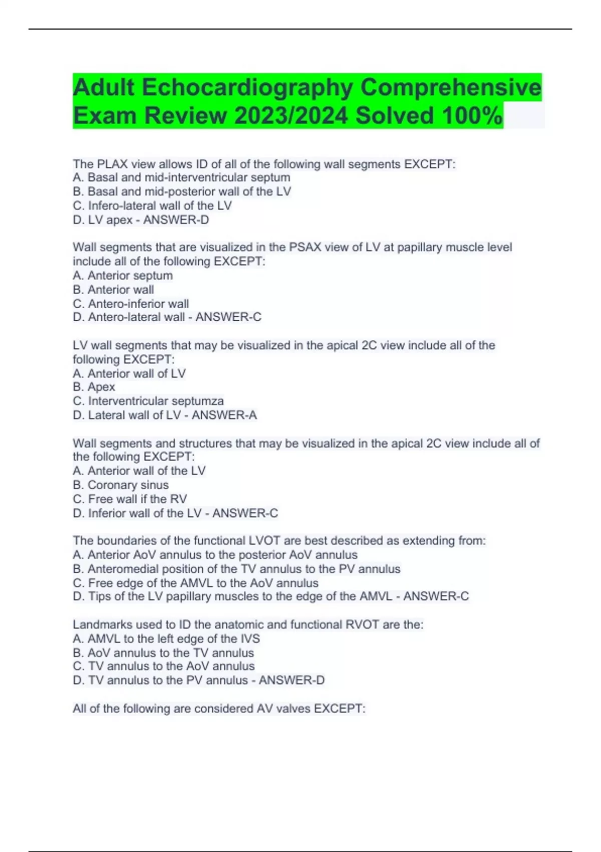 Adult Echocardiography Comprehensive Exam Review 2023/2024 Solved 100%