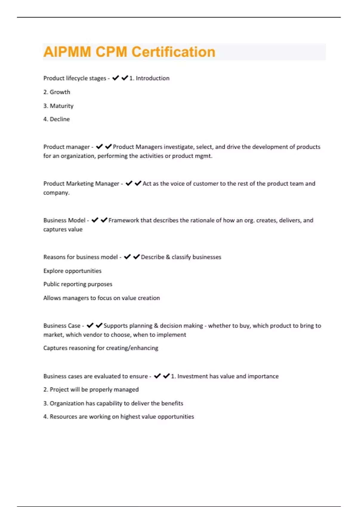 Product lifecycle stages - 1. Introduction 2. Growth 3. Maturity 4. Decline Product manager - Product Managers investigate, select, and drive the development of products for an organization, performing the activities or product mgmt. Product Marketing Manager - Act as the voice of customer to the rest of the product team and company. Business Model - Framework that describes the rationale of how an org. creates, delivers, and captures value Reasons for business model - Describe & classify businesses Explore opportunities Public reporting purposes Allows managers to focus on value creation Business Case - Supports planning & decision making - whether to buy, which product to bring to market, which vendor to choose, when to implement Captures reasoning for creating/enhancing Business cases are evaluated to ensure - 1. Investment has value and importance 2. Project will be properly managed 3. Organization has capability to deliver the benefits 4. Resources are working on highest value opportunities5. Projects with inter-dependencies are started in optimum sequence Levels of a product - 1. Core - benefit 2. Actual - Product appearance - design, brand, packaging, quality, functionality 3. Extended product - Payment terms, delivery, warranty, Maintenance & care, on site service, education/training Characteristics of a service - intangible, perishable, variable, inseparable Product lifecycle phases -Conceive, plan, develop, qualify, launch, deliver, retire