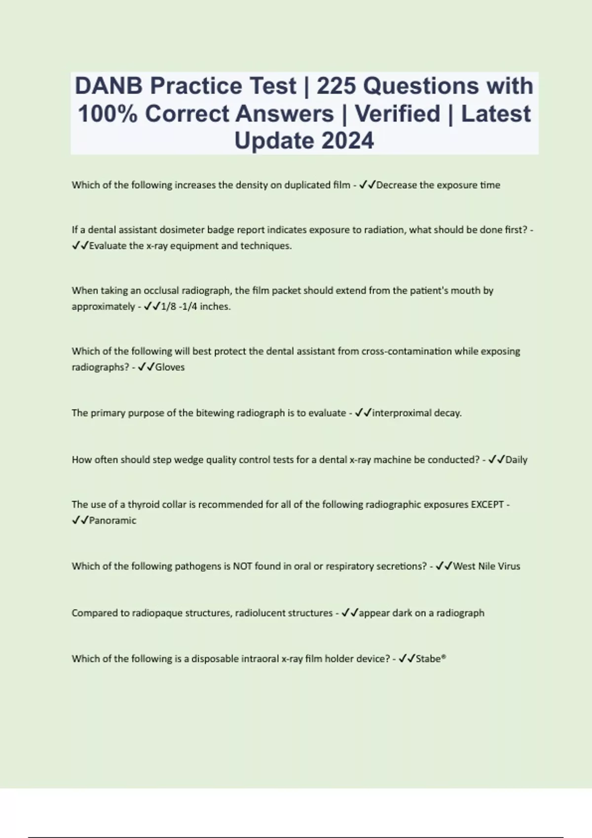 DANB Practice Test | 225 Questions with 100% Correct Answers | Verified | Latest Update 2024