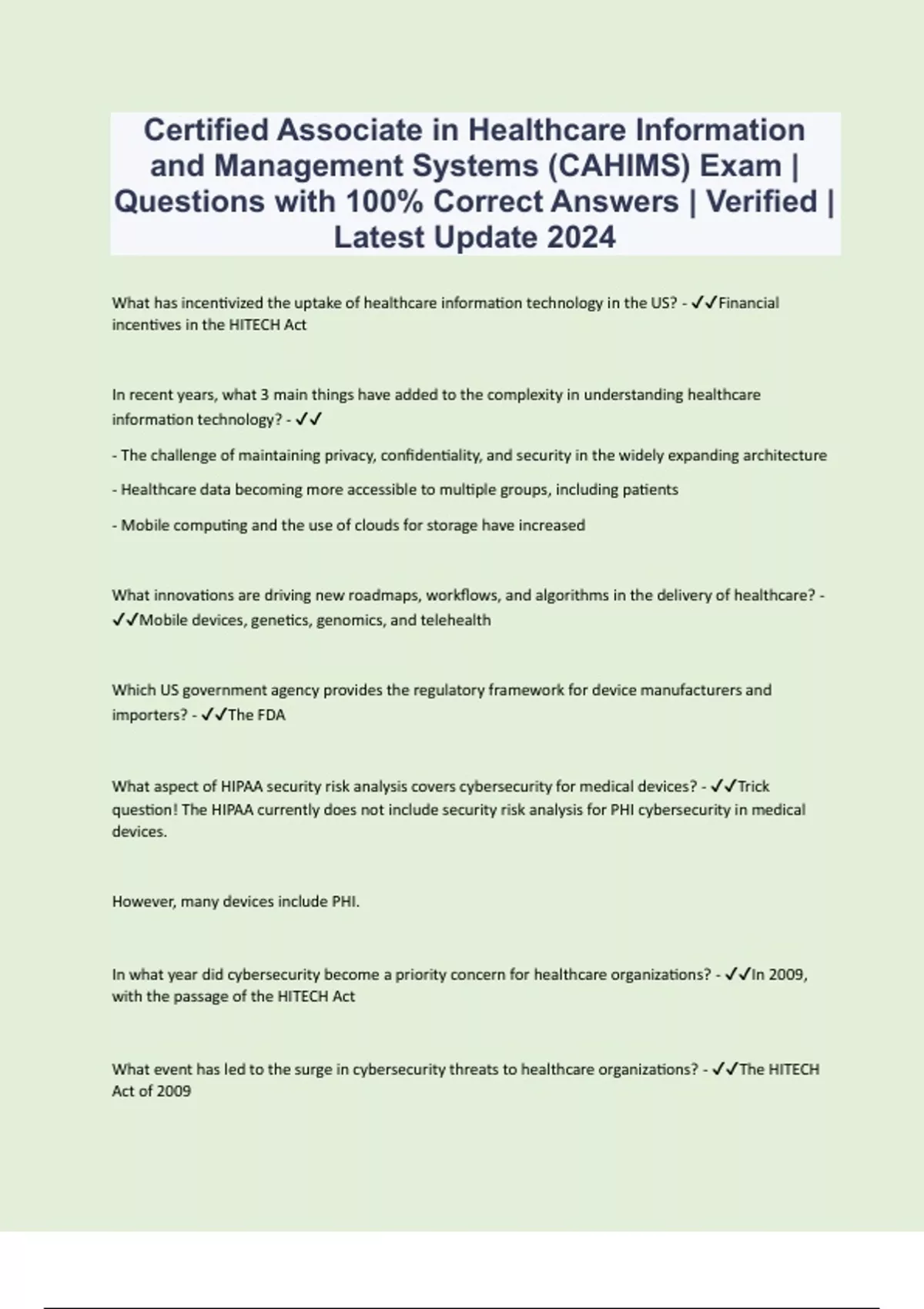 Certified Associate in Healthcare Information and Management Systems (CAHIMS) Exam | Questions with 100% Correct Answers | Verified | Latest Update 2024