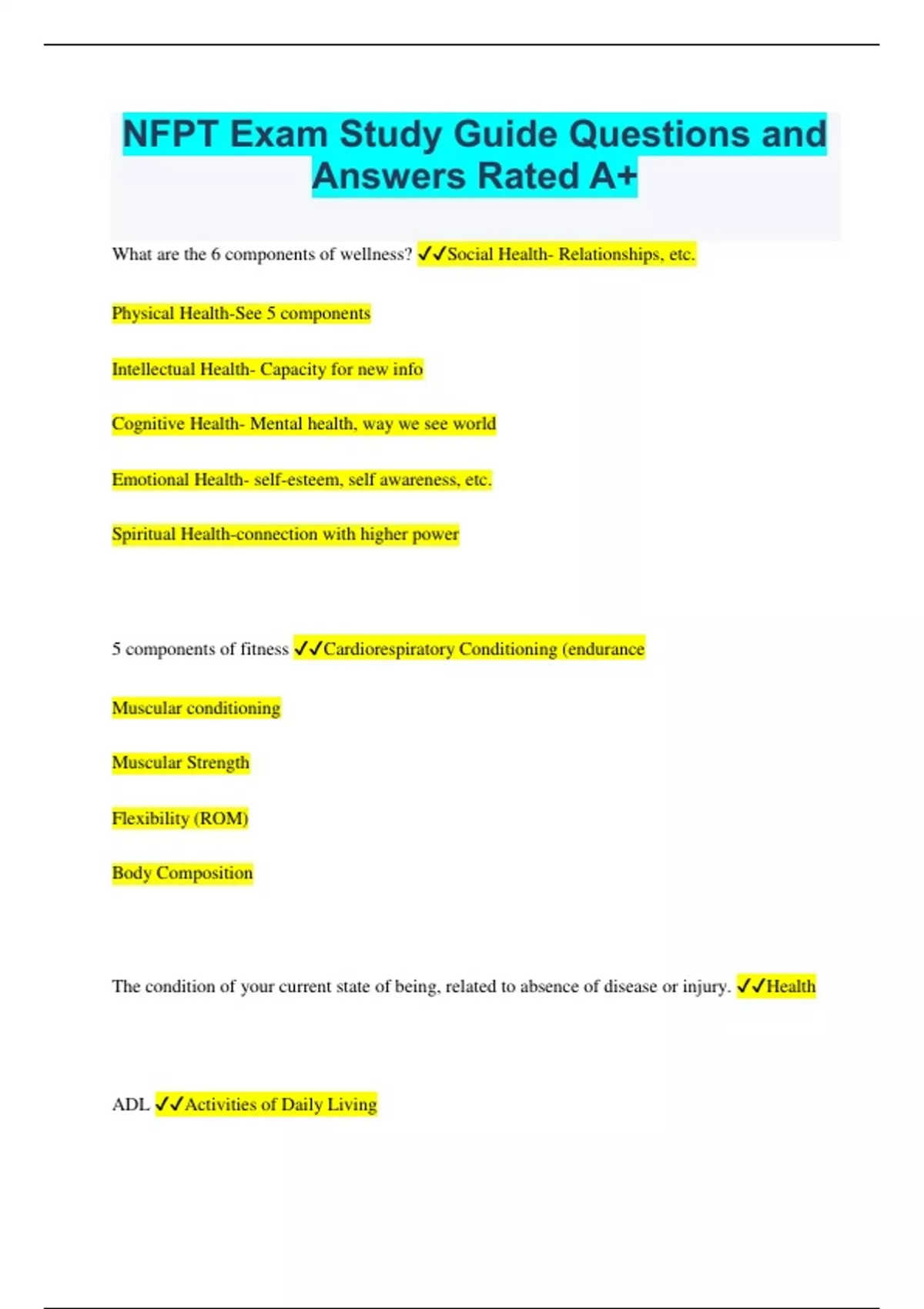 NFPT Exam Study Guide Questions and Answers Rated A+ What are the 6 components of wellness? Social Health- Relationships, etc. Physical Health-See 5 components Intellectual Health- Capacity for new info Cognitive Health- Mental health, way we see world Emotional Health- self-esteem, self awareness, etc. Spiritual Health-connection with higher power 5 components of fitness Cardiorespiratory Conditioning (endurance Muscular conditioning Muscular Strength Flexibility (ROM) Body Composition The condition of your current state of being, related to absence of disease or injury. Health ADL Activities of Daily Living 3 influential aspects of behavior that will contribute to positivity. Predisposing factors, ex knowledge Enabling factors, ex. skills, resources Reinforcing factors, ex praise from others. Muscular System Produces force, maintains posture, allows for movement, produces heat Skeletal System Body's structural support and protection Circulatory System Pumps blood to/from body. Sustained by heart and lungs. Respiratory System Deals with breathing. O in CO2 out Nervous System Communicates all autonomic and voluntary messages to all body parts with the brain, spinal chord, and nerves. Digestive system Takes in, breaks down, transports, potentially transforms, and eliminates all food substances so that they can provide energy. Immune System Protects body from attacks by pathogens. One of smallest systems, but one of most spread out and important. Endocrine System System of glands that communicate and maintain homeostasis using specific hormone secretions into the blood stream. Integymentary System Protects the body. Ex. Fat, skin,m hair, nails. Urinary system. Renal system. Elimination of waste, regulation of blood volunme, controls electrolytes and metabolites. Origin Proximal. Point at which the muscle joins the