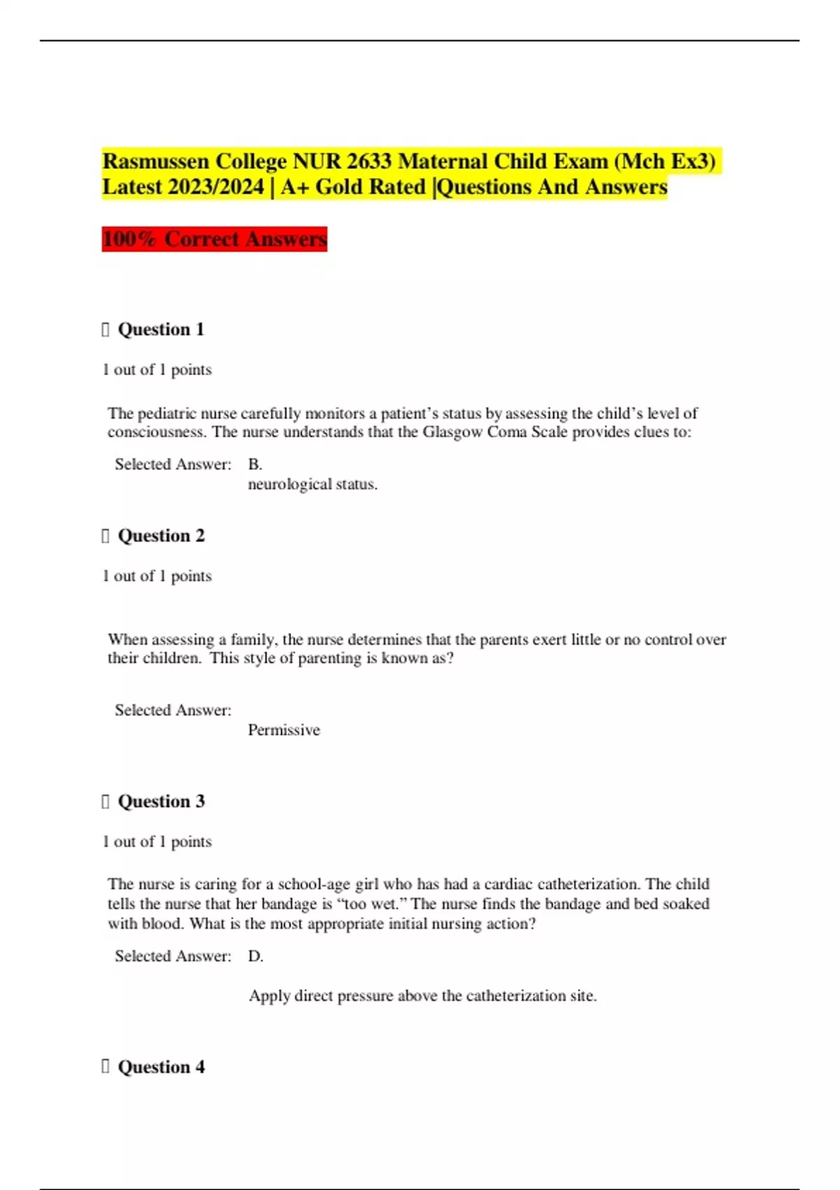 Rasmussen College NUR 2633 Maternal Child Exam (Mch Ex3) Latest 2023/2024 | A+ Gold Rated |Questions And Answers 100% Correct Answers