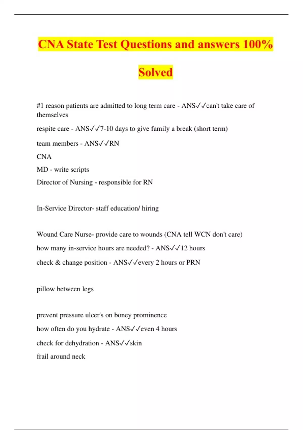 CNA State Test Questions and answers 100% Solved #1 reason patients are admitted to long term care - ANScan't take care of themselves respite care - ANS7-10 days to give family a break (short term) team members - ANSRN CNA MD - write scripts Director of Nursing - responsible for RN In-Service Director- staff education/ hiring Wound Care Nurse- provide care to wounds (CNA tell WCN don't care) how many in-service hours are needed? - ANS12 hours check & change position - ANSevery 2 hours or PRN pillow between legs prevent pressure ulcer's on boney prominence how often do you hydrate - ANSeven 4 hours check for dehydration - ANSskin frail around nec
