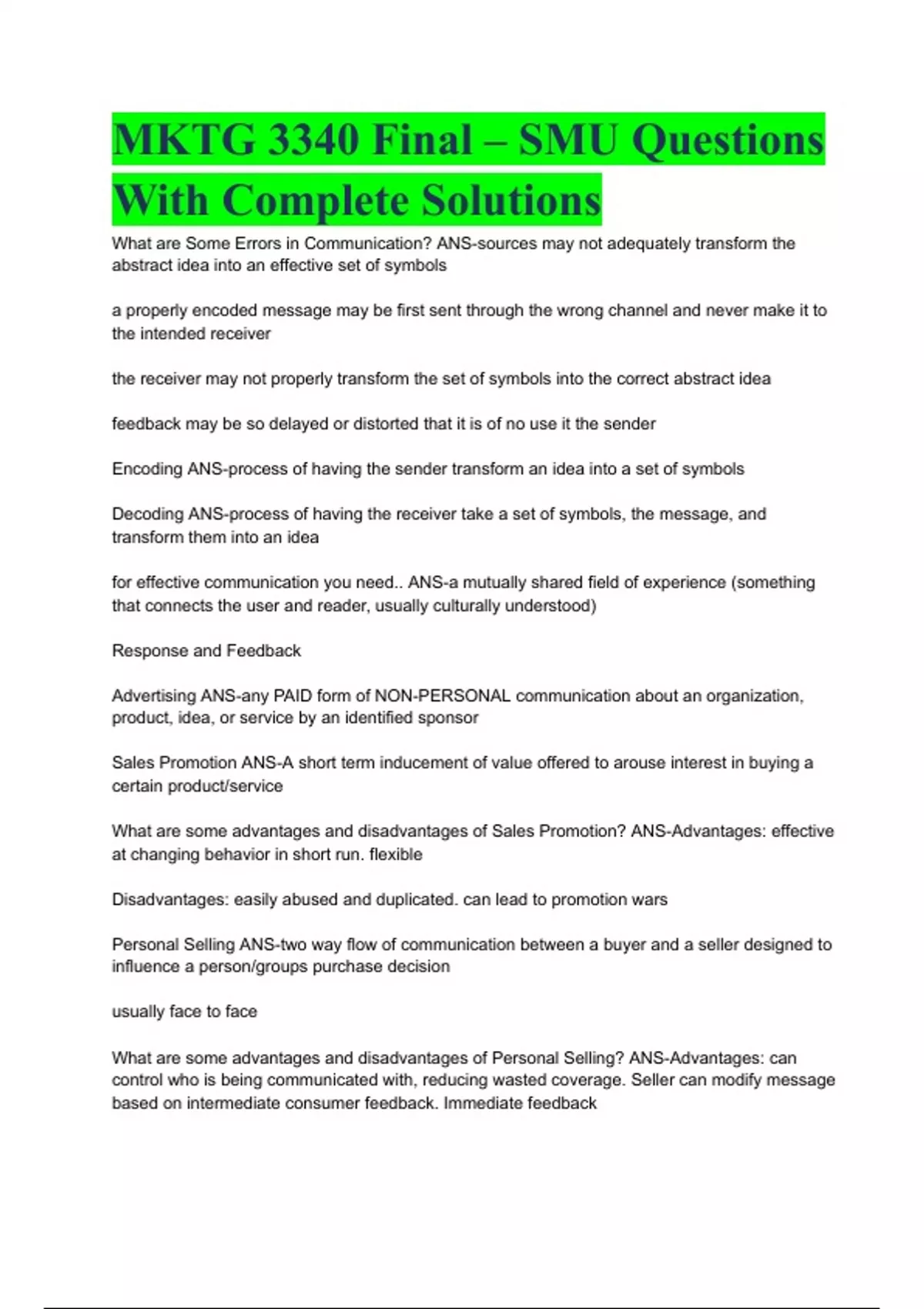 MKTG 3340 Final – SMU Questions With Complete Solutions What are Some Errors in Communication? ANS-sources may not adequately transform the abstract idea into an effective set of symbols a properly encoded message may be first sent through the wrong channel and never make it to the intended receiver the receiver may not properly transform the set of symbols into the correct abstract idea feedback may be so delayed or distorted that it is of no use it the sender Encoding ANS-process of having the sender transform an idea into a set of symbols Decoding ANS-process of having the receiver take a set of symbols, the message, and transform them into an idea for effective communication you need.. ANS-a mutually shared field of experience (something that connects the user and reader, usually culturally understood) Response and Feedback Advertising ANS-any PAID form of NON-PERSONAL communication about an organization, product, idea, or service by an identified sponsor Sales Promotion ANS-A short term inducement of value offered to arouse interest in buying a certain product/service What are some advantages and disadvantages of Sales Promotion? ANS-Advantages: effective at changing behavior in short run. flexible Disadvantages: easily abused and duplicated. can lead to promotion wars Personal Selling ANS-two way flow of communication between a buyer and a seller designed to influence a person/groups purchase decision usually face to face What are some advantages and disadvantages of Personal Selling? ANS-Advantages: can control who is being communicated with, reducing wasted coverage. Seller can modify message based on intermediate consumer feedback. Immediate feedback Disadvantages: Flexibility can result in unorganized/ not universal message. very costly Product Life Cycle ANS-introduction growth maturity decline Introduction Stage ANS-Informing consumers in an effort to increase their awareness. Uses all of the promotional elements (focus on advertising) Growth Stage ANS-Persuade the consumer to buy the product rather than substitutes, so the marketing manager seeks to gain brand loyalty and solidify distribution Takes focus off of sales promotions and publicity Maturity Stage ANS-Maintain existing buyers Focus on sales promotions Decline Stage ANS-A period of phase out for the product. Little money spent on the promotional elements. 3 Categories for Product Characteristics ANS-1.Compatibility 2.Risk 3