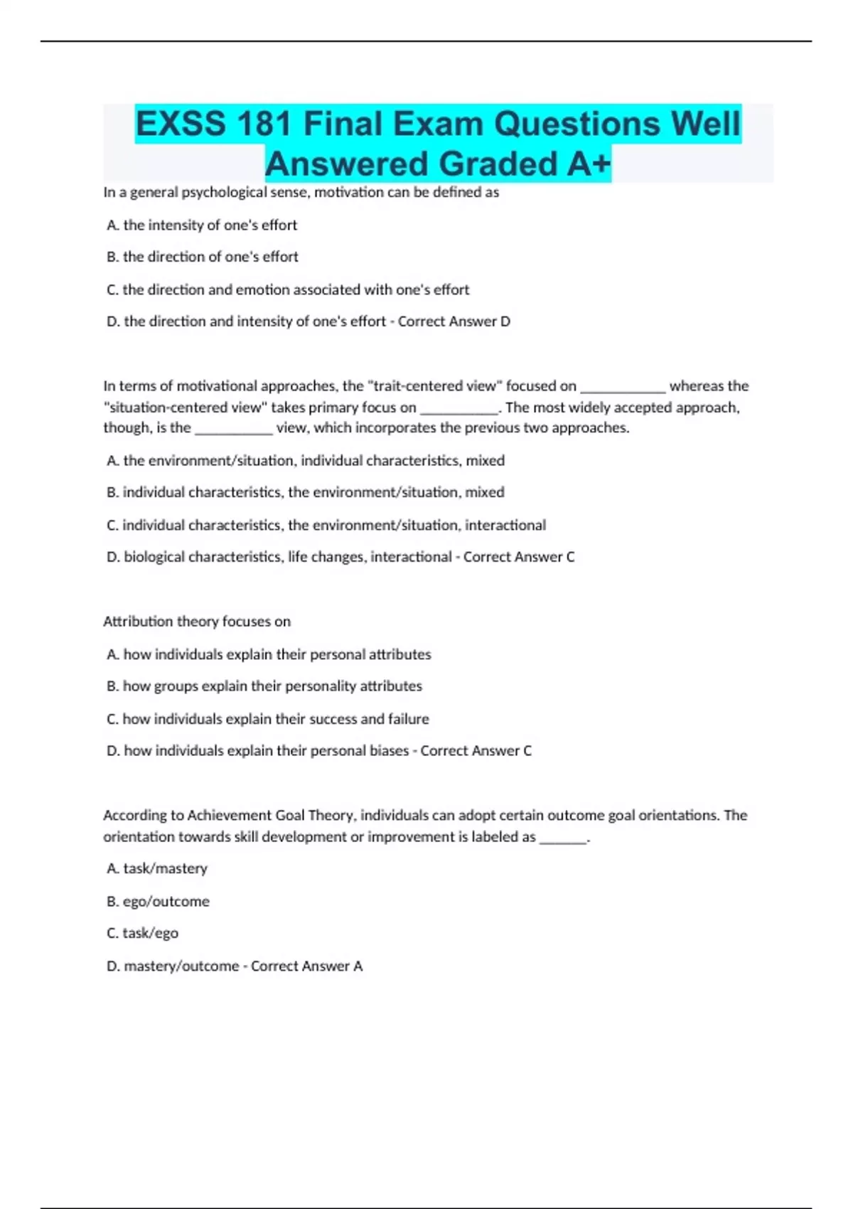 EXSS 181 Final Exam Questions Well Answered Graded A+ In a general psychological sense, motivation can be defined as A. the intensity of one's effort B. the direction of one's effort C. the direction and emotion associated with one's effort D. the direction and intensity of one's effort - Correct Answer D In terms of motivational approaches, the "trait-centered view" focused on ___________ whereas the "situation-centered view" takes primary focus on __________. The most widely accepted approach, though, is the __________ view, which incorporates the previous two approaches. A. the environment/situation, individual characteristics, mixed B. individual characteristics, the environment/situation, mixed C. individual characteristics, the environment/situation, interactional D. biological characteristics, life changes, interactional - Correct Answer C Attribution theory focuses on A. how individuals explain their personal attributes B. how groups explain their personality attributes C. how individuals explain their success and failure D. how individuals explain their personal biases - Correct Answer C According to Achievement Goal Theory, individuals can adopt certain outcome goal orientations. The orientation towards skill development or improvement is labeled as ______. A. task/mastery B. ego/outcome C. task/ego D. mastery/outcome - Correct Answer A
