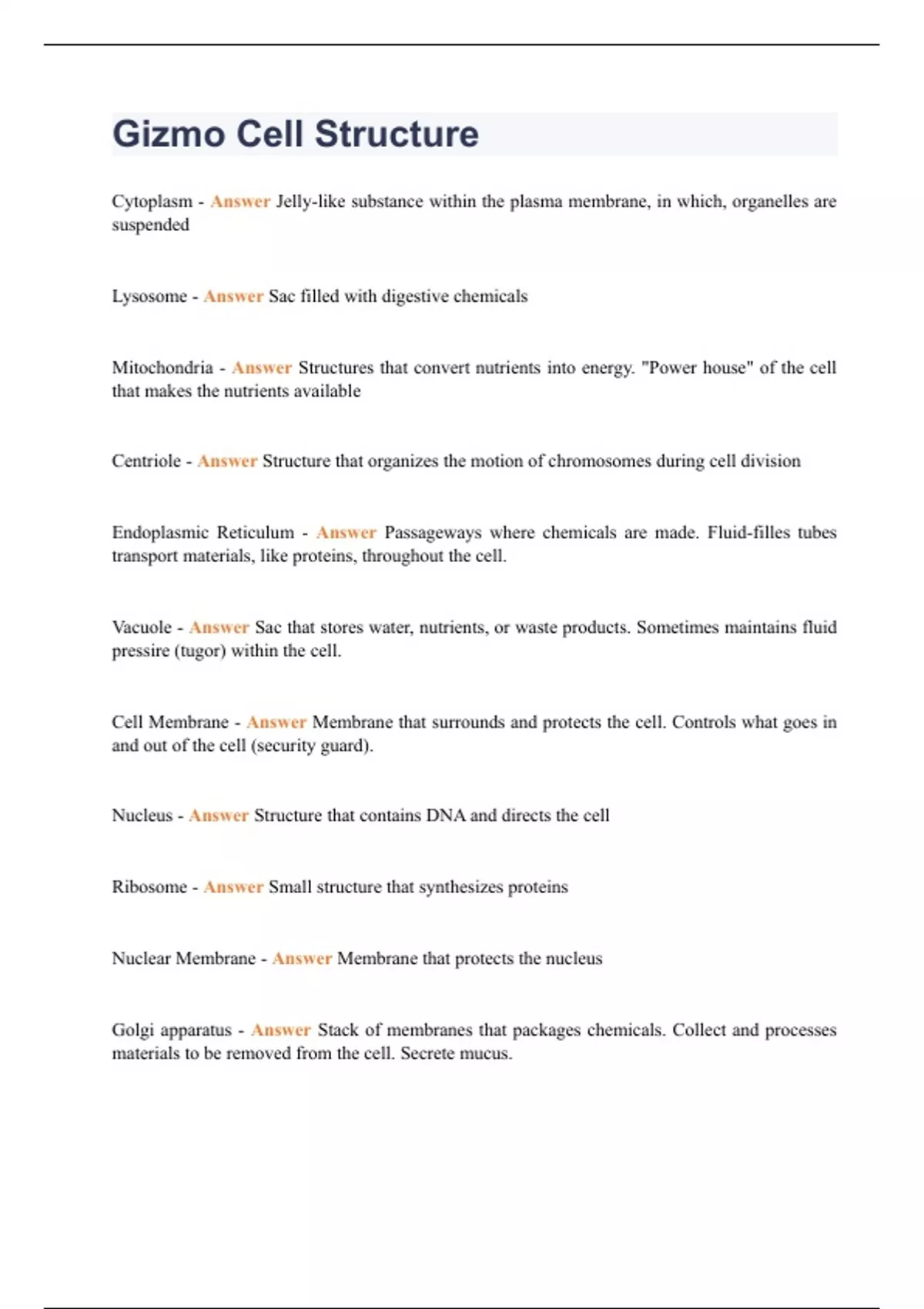 Gizmo Cell Structure questions and certified answers 2023/2024 Cytoplasm - Answer Jelly-like substance within the plasma membrane, in which, organelles are suspended Lysosome - Answer Sac filled with digestive chemicals Mitochondria - Answer Structures that convert nutrients into energy. "Power house" of the cell that makes the nutrients available Centriole - Answer Structure that organizes the motion of chromosomes during cell division Endoplasmic Reticulum - Answer Passageways where chemicals are made. Fluid-filles tubes transport materials, like proteins, throughout the cell. Vacuole - Answer Sac that stores water, nutrients, or waste products. Sometimes maintains fluid pressire (tugor) within the cell. Cell Membrane - Answer Membrane that surrounds and protects the cell. Controls what goes in and out of the cell (security guard). Nucleus - Answer Structure that contains DNA and directs the cell Ribosome - Answer Small structure that synthesizes proteins