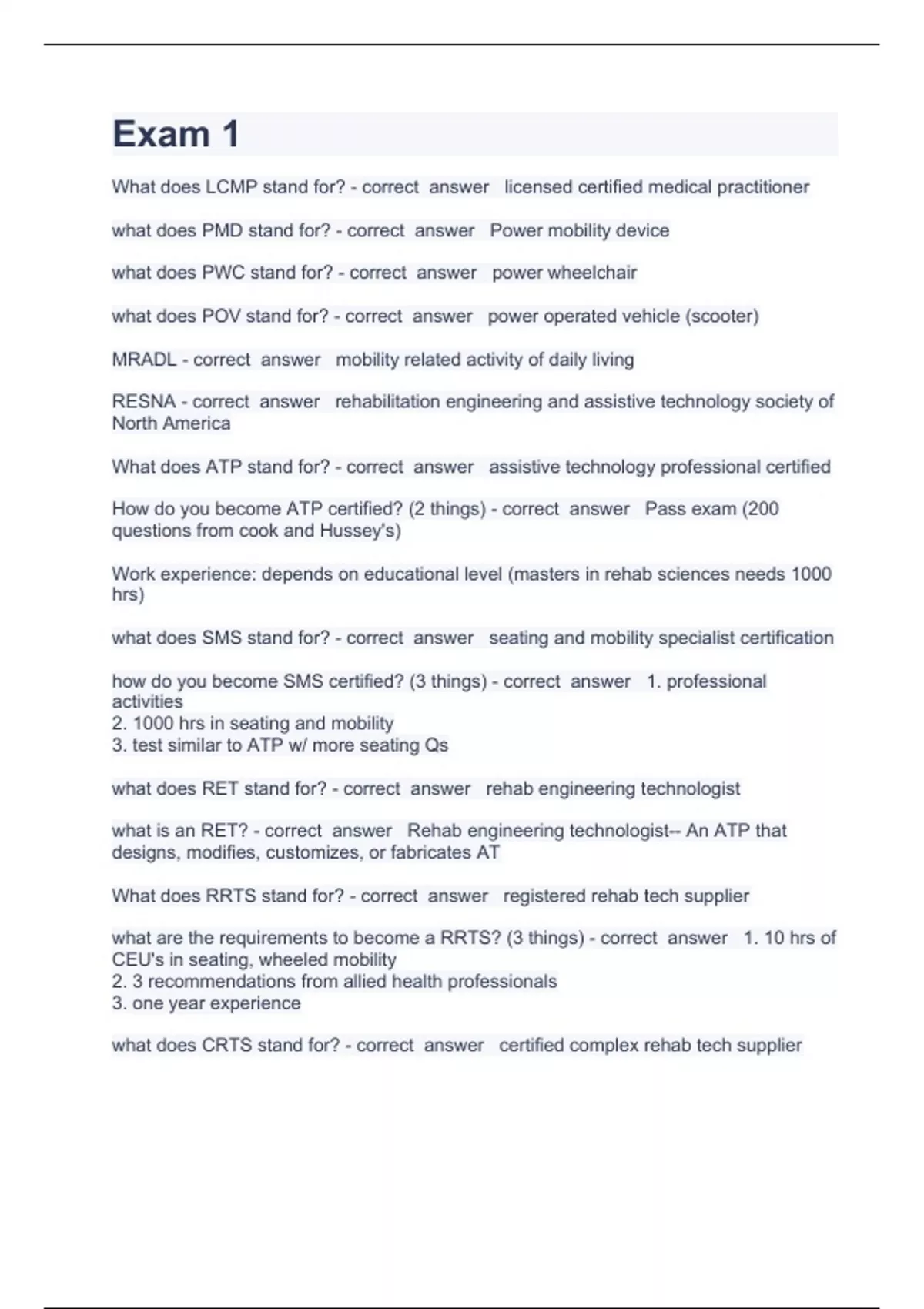 Exam 14 Question and answers correctly solved 2023/2024What does LCMP stand for? - correct answer licensed certified medical practitioner what does PMD stand for? - correct answer Power mobility device what does PWC stand for? - correct answer power wheelchair what does POV stand for? - correct answer power operated vehicle (scooter) MRADL - correct answer mobility related activity of daily living RESNA - correct answer rehabilitation engineering and assistive technology society of North America What does ATP stand for? - correct answer assistive technology professional certified How do you becom