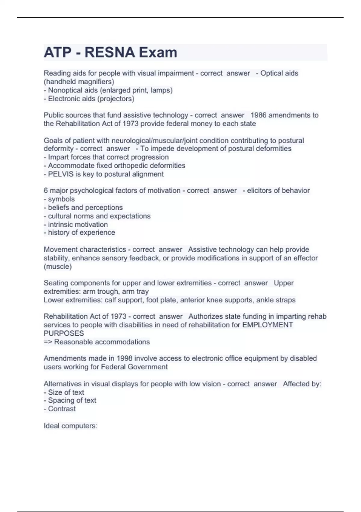 ATP1 Questions with complete solution 2023/2024Reading aids for people with visual impairment - correct answer - Optical aids (handheld magnifiers) - Nonoptical aids (enlarged print, lamps) - Electronic aids (projectors) Public sources that fund assistive technology - correct answer 1986 amendments to the Rehabilitation Act of 1973 provide federal money to each state Goals of patient with neurological/muscular/joint condition contributing to postural deformity - correct answer - To impede development of postural deformities - Impart forces that correct progression - Accommodate fixed orthopedic deformities - PELVIS is key to postural alignment 6 major psychological factors of motivation - correct answer - elicitors of behavior - symbols