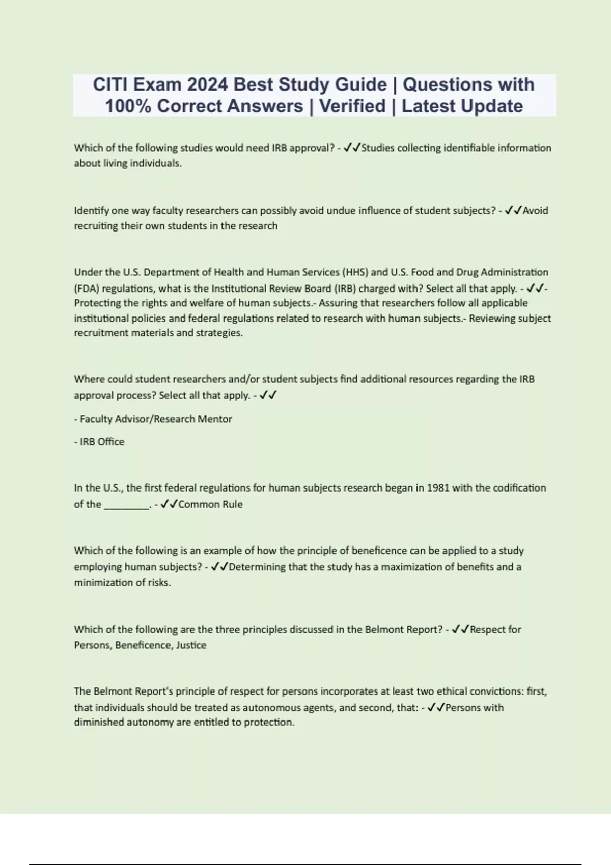 CITI Exam 2024 Best Study Guide | Questions with 100% Correct Answers | Verified | Latest Update