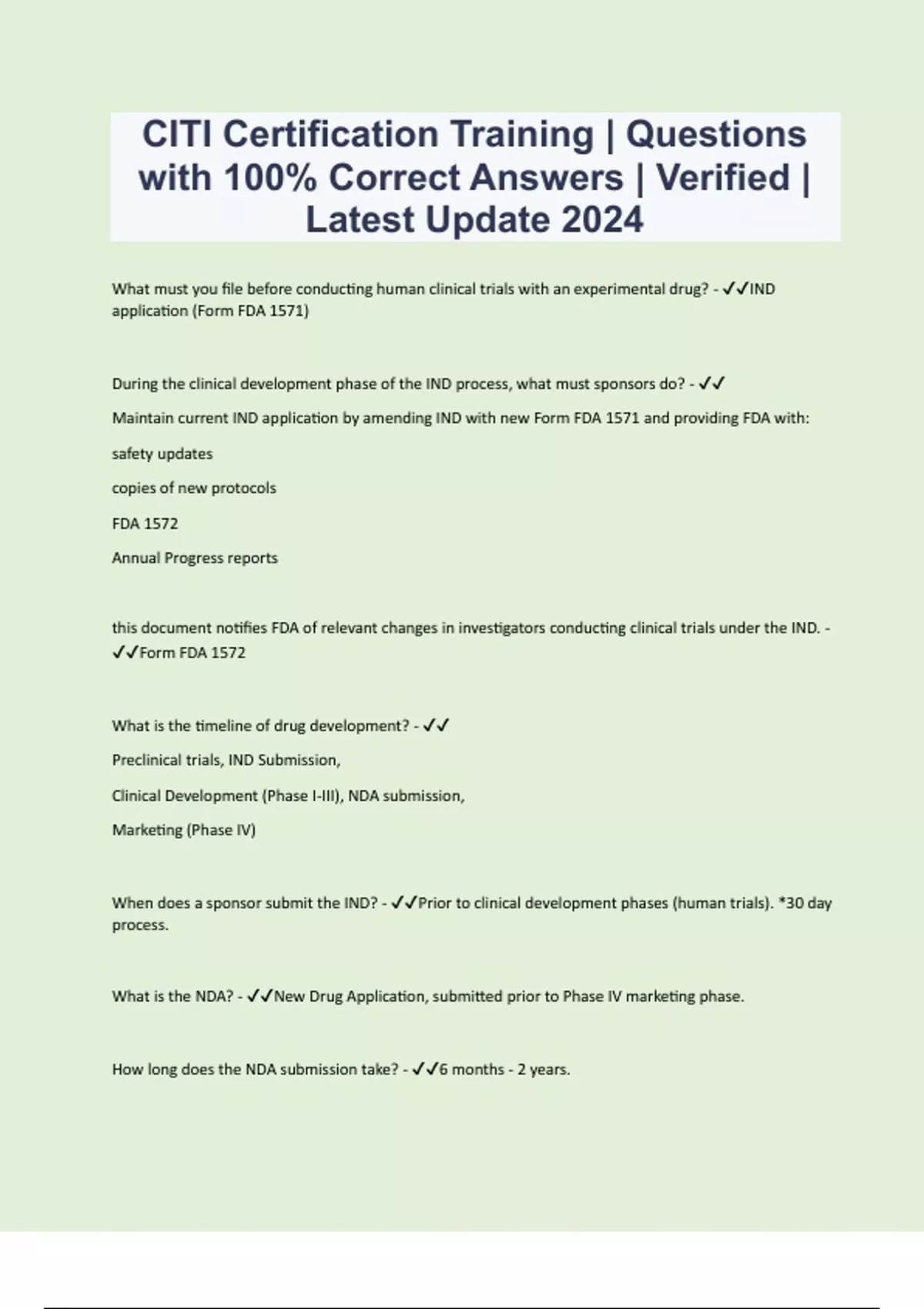 What must you file before conducting human clinical trials with an experimental drug? - IND application (Form FDA 1571) During the clinical development phase of the IND process, what must sponsors do? - Maintain current IND application by amending IND with new Form FDA 1571 and providing FDA with: safety updates copies of new protocols FDA 1572 Annual Progress reports this document notifies FDA of relevant changes in investigators conducting clinical trials under the IND. - Form FDA 1572 What is the timeline of drug development? - Preclinical trials, IND Submission, Clinical Development (Phase I-III), NDA submission, Marketing (Phase IV)