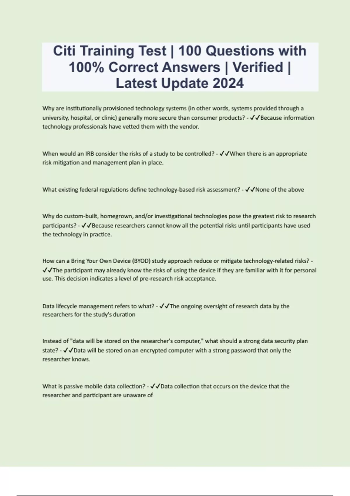 Citi Training Test | 100 Questions with 100% Correct Answers | Verified | Latest Update 2024