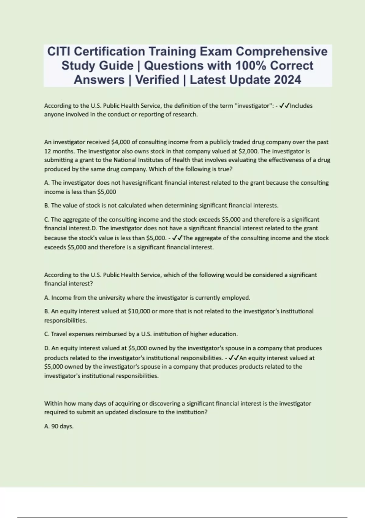 CITI Certification Training Exam Comprehensive Study Guide | Questions with 100% Correct Answers | Verified | Latest Update 2024 | 54 Pages