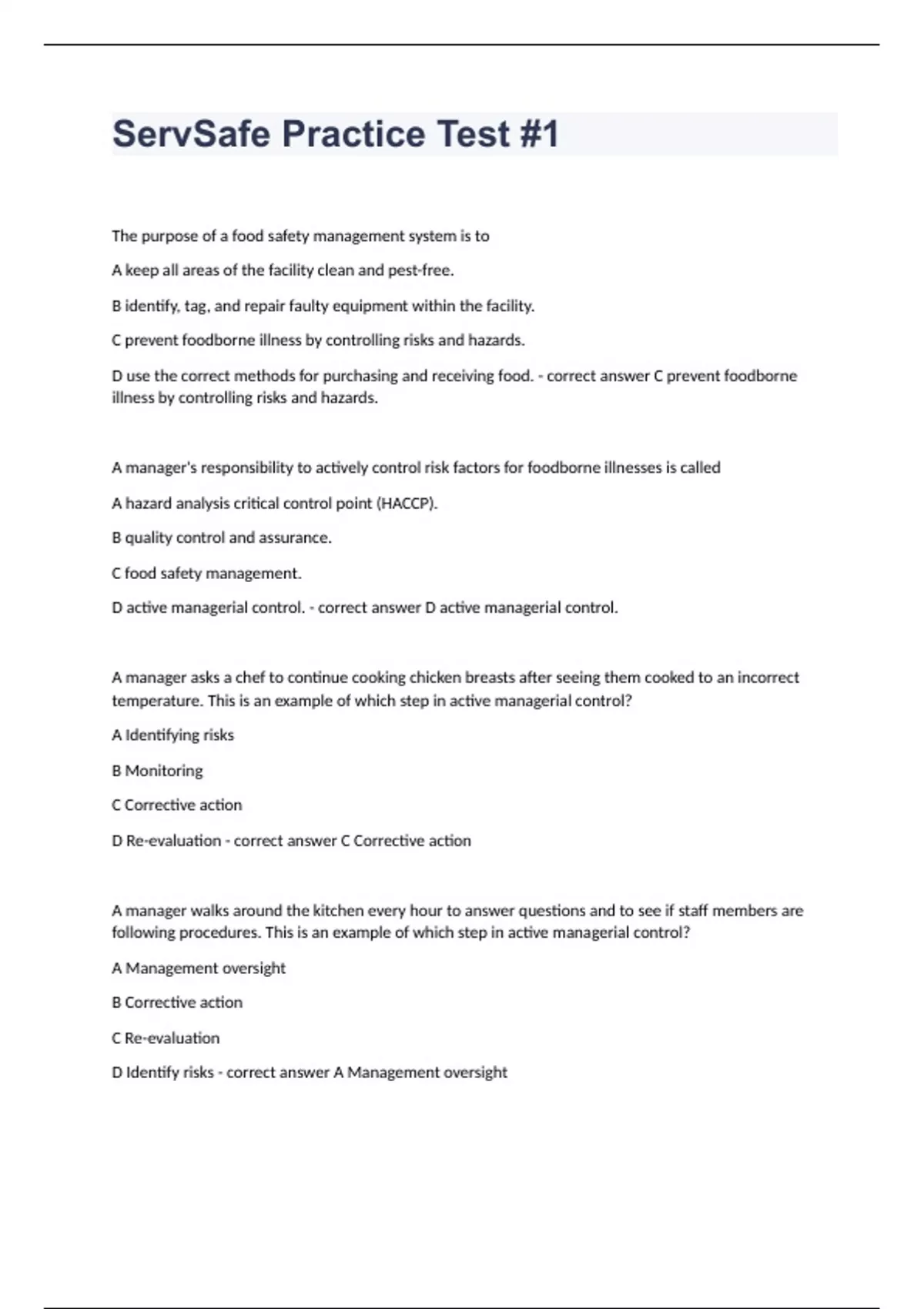 ServSafe Practice Test Question and answers already passed 2023/2024The purpose of a food safety management system is to A keep all areas of the facility clean and pest-free. B identify, tag, and repair faulty equipment within the facility. C prevent foodborne illness by controlling risks and hazards. D use the correct methods for purchasing and receiving food. - correct answer C prevent foodborne illness by controlling risks and hazards. A manager's responsibility to actively control risk factors for foodborne illnesses is called A hazard analysis critical control point (HACCP). B quality control and assurance. C food safety management. D active managerial co