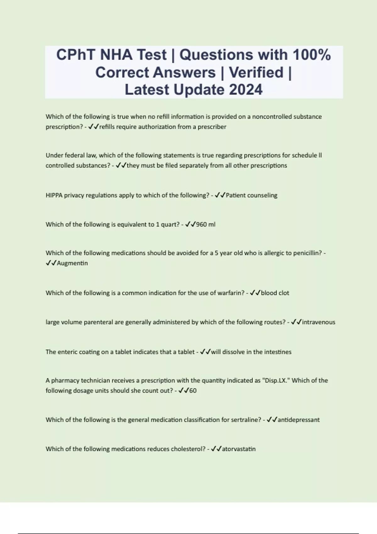 CPhT NHA Test | Questions with 100% Correct Answers | Verified | Latest Update 2024