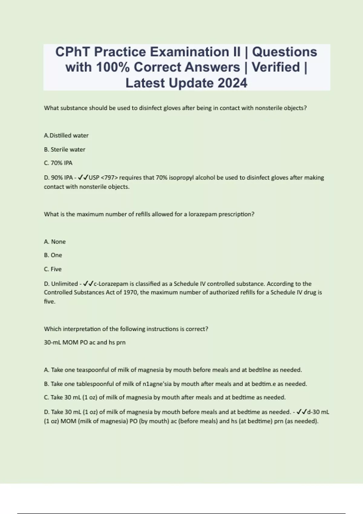 CPhT Practice Examination II | Questions with 100% Correct Answers | Verified | Latest Update 2024 | 30 Pages