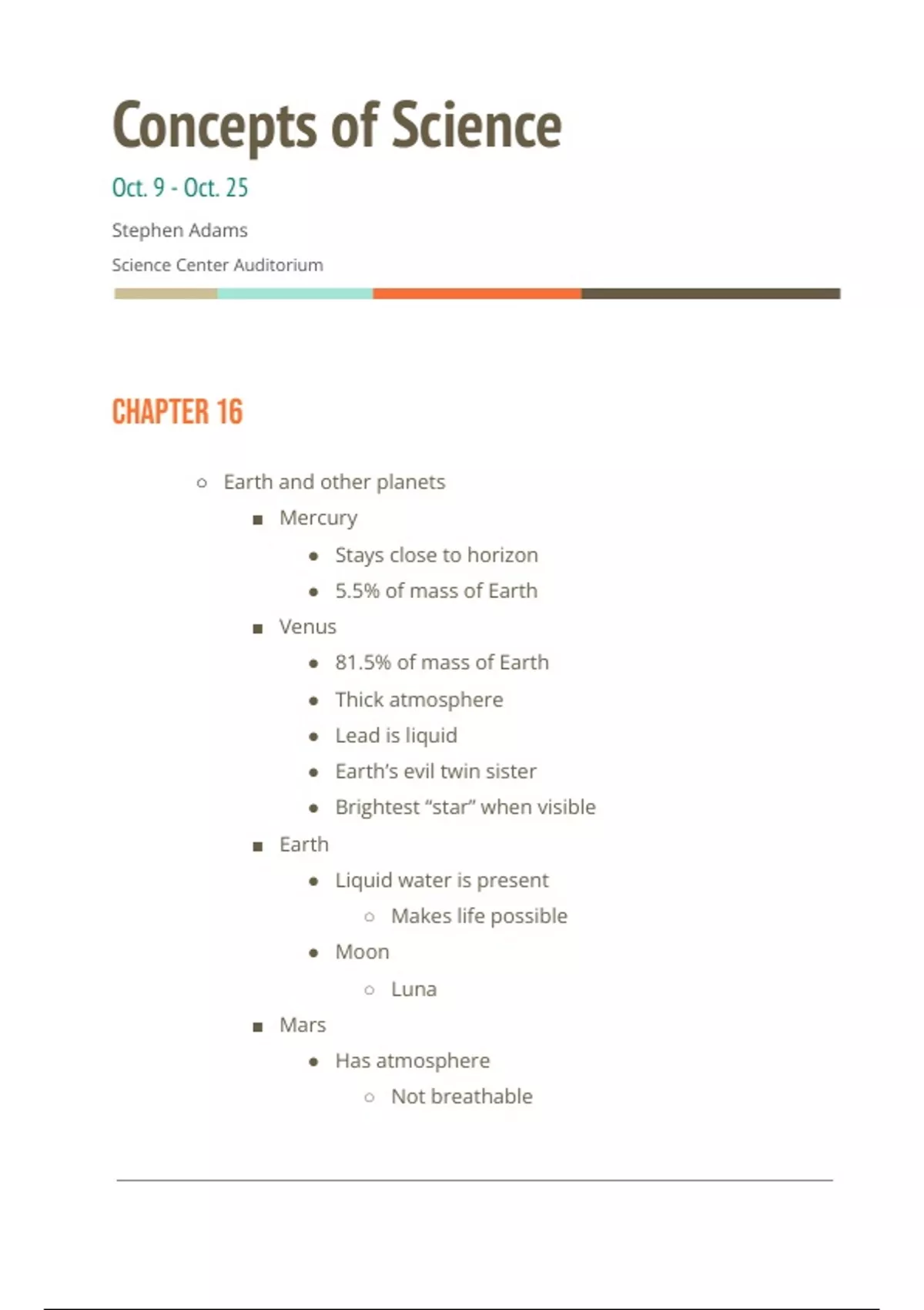 Bullet point notes from Dr. Stephen Adam's lectures on unit 3 in Concepts of Science covering astronomy, the Nebular theory, geology, and ecology. These notes are set up perfect for study reference material and a way to jog your memory for exams