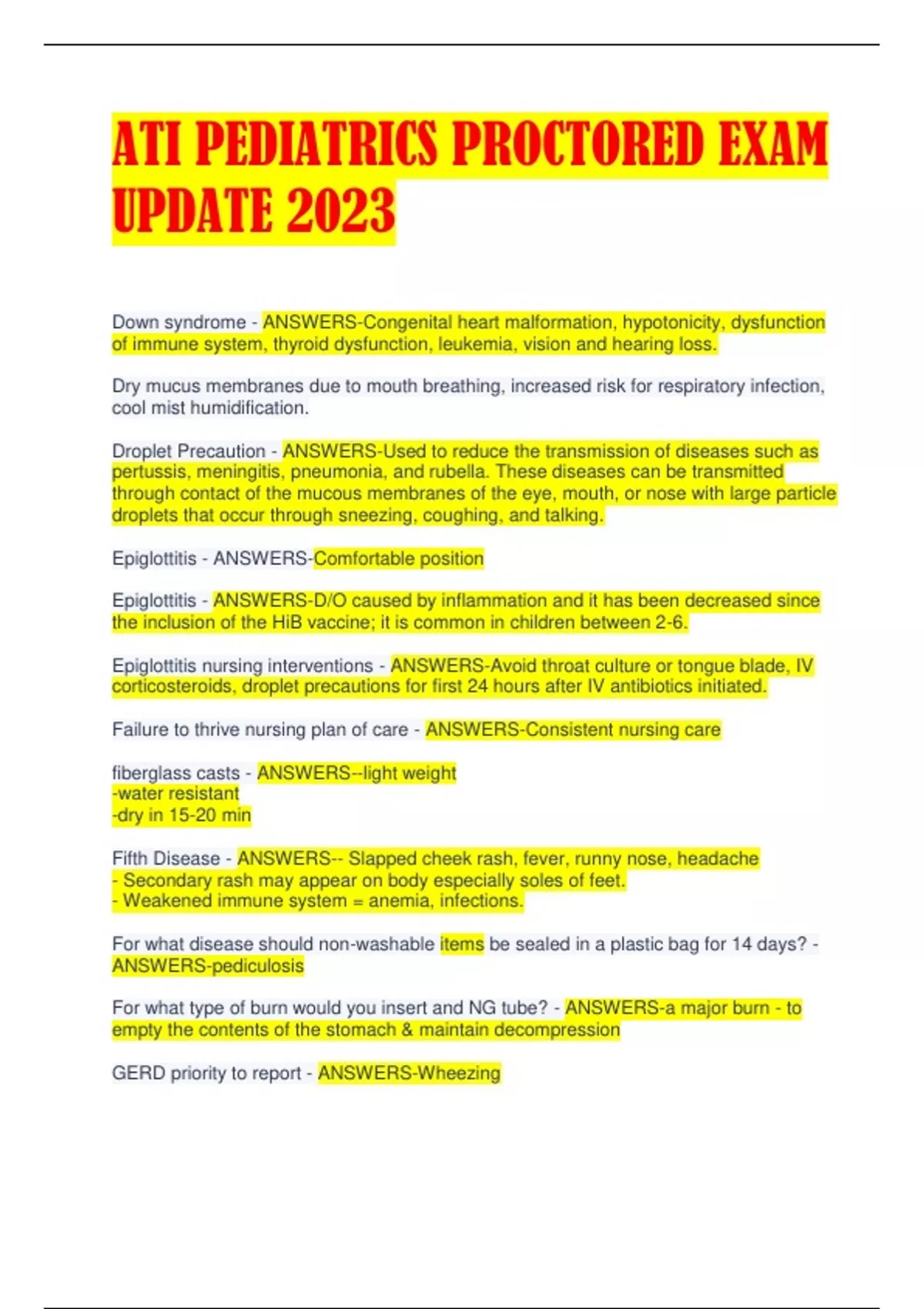 ATI PEDIATRICS PROCTORED EXAM UPDATE 2023 Down syndrome - ANSWERS-Congenital heart malformation, hypotonicity, dysfunction of immune system, thyroid dysfunction, leukemia, vision and hearing loss. Dry mucus membranes due to mouth breathing, increased risk for respiratory infection, cool mist humidification. Droplet Precaution - ANSWERS-Used to reduce the transmission of diseases such as pertussis, meningitis, pneumonia, and rubella. These diseases can be transmitted through contact of the mucous membranes of the eye, mouth, or nose with large particle droplets that occur through sneezing, coughing, and talking. Epiglottitis - ANSWERS-Comfortable position Epiglottitis - ANSWERS-D/O caused by inflammation and it has been decreased since the inclusion of the HiB vaccine; it is common in children between 2-6. Epiglottitis nursing interventions - ANSWERS-Avoid throat culture or tongue blade, IV corticosteroids, droplet precautions for first 24 hours after IV antibiotics initiated. Failure to thrive nursing plan of care - ANSWERS-Consistent nursing care fiberglass casts - ANSWERS--light weight -water resistant -dry in 15-20 min Fifth Disease - ANSWERS-- Slapped cheek rash, fever, runny nose, headache - Secondary rash may appear on body especially soles of feet. - Weakened immune system = anemia, infections. For what disease should non-washable items be sealed in a plastic bag for 14 days? - ANSWERS-pediculosis For what type of burn would you insert and NG tube? - ANSWERS-a major burn - to empty the contents of the stomach & maintain decompression GERD priority to report - ANSWERS-Wheezing Glomerulonephritis lab value to be present - ANSWERS-Antistreptolysin (ASO titer) H&H levels - ANSWERS-HCT -2 MO=28-42% -6-12 YR=35-45% -12-18 YR=37-49% M, 36-46% F HGB -2 MO=9-14 -6-12 YR=11.5-15.5 -12-18 YR=13-16 M, 12-16 F hand preference - ANSWERS-all kids normally show hand preference by 1 year old Head injury what to report - ANSWERS-Vomiting Head lice - ANSWERS-Comb nits off Hemolytic uremic syndrome nurse should expect which labs - ANSWERS-Acute renal failure, hemolytic anemia, thrombocytopenia. Decreased H&H. Hemorrhage Cystitis - ANSWERS-is the sudden onset of hematuria combined with bladder pain and irritative bladder symptoms. - mesna (Mesnex) protect the bladder. HIV Preschooler - ANSWERS-- Immunizations contraindicated for this patient is the oral polio - the child is susceptible to infection and must be immunized to the common preventable childhood diseases. - However, the oral polio vaccine contains a form of the virus that in SOME clients can lead to an actual case of polio, this risk is increased with HIV and must receive the injectable form of the polio immunization. Home safety SATA - ANSWERS-Put safety gates at the top and bottom of stairs, crib mattress in lowest position How do you administer iron elixir patient teaching - ANSWERS-similar to Question 3 page 129 - -Give 1 hr before or 2 hr after mild or antacid to prevent decreased absorption -GI upset (diarrhea, constipation, nausea) is common at the start of therapy -if tolerated, administer iron supplements on empty stomach -give with vitamin C to increase absorption -use z-track into deep muscle for parenteral injected; do not massage after