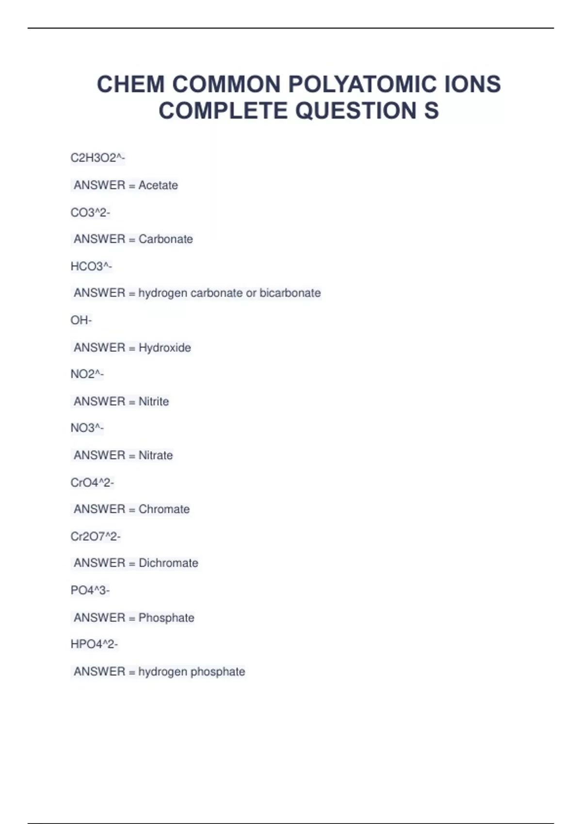 CHEM COMMON POLYATOMIC IONS COMPLETE QUESTION AND ANSWERS