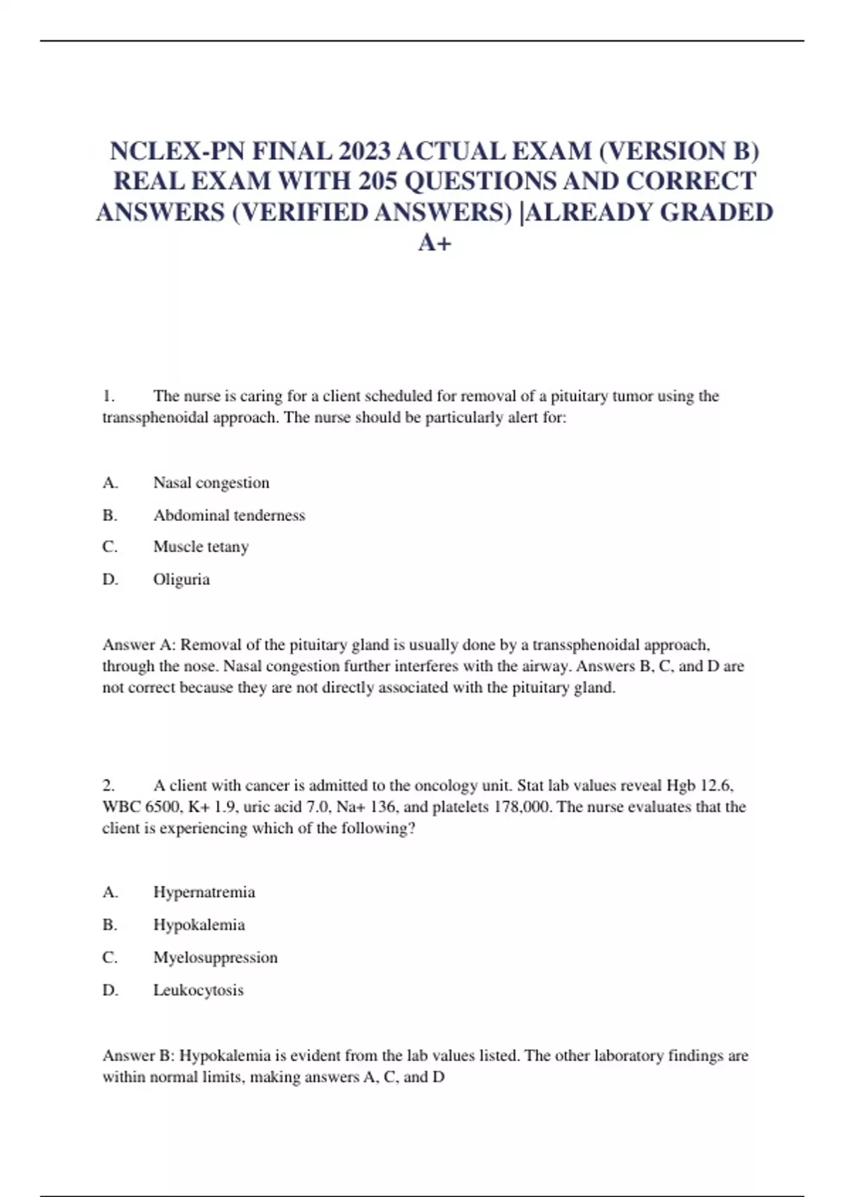 NCLEX-PN FINAL 2023 ACTUAL EXAM (VERSION B) REAL EXAM WITH 205 QUESTIONS AND CORRECT ANSWERS (VERIFIED ANSWERS) |ALREADY GRADED A+