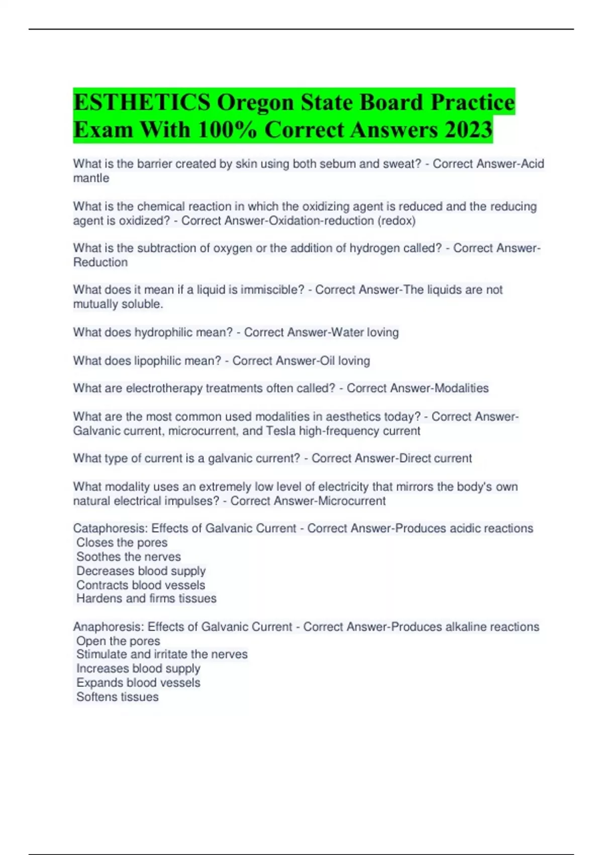 ESTHETICS Oregon State Board Practice Exam With 100% Correct Answers