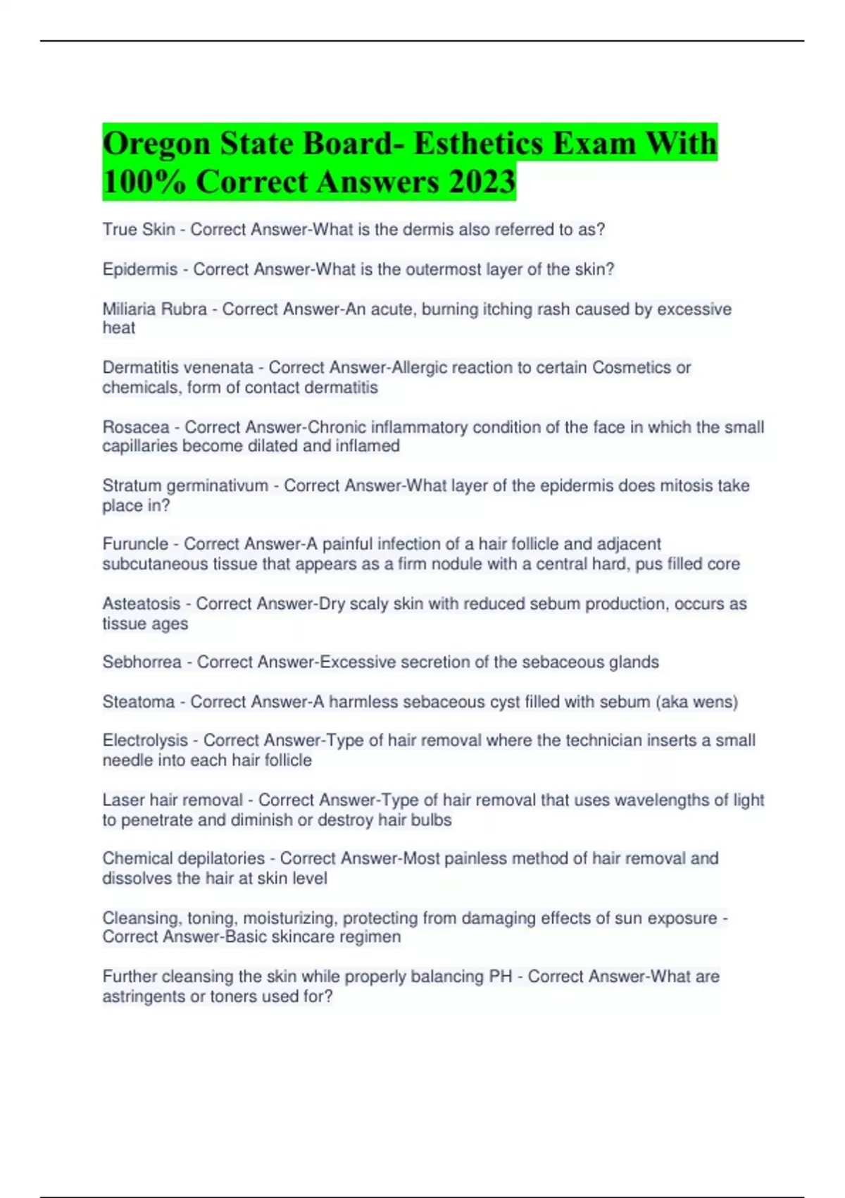 Oregon State Board- Esthetics Exam With 100% Correct Answers