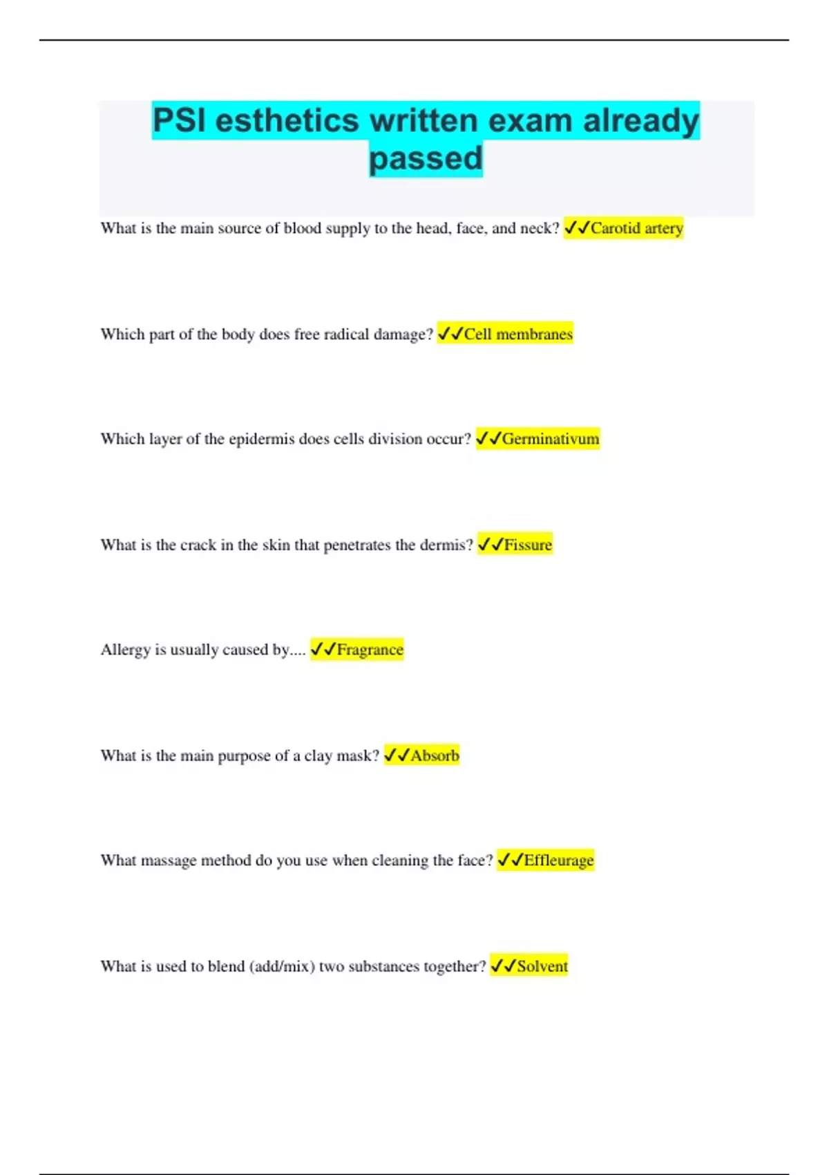 What is the main source of blood supply to the head, face, and neck? Carotid artery Which part of the body does free radical damage? Cell membranes Which layer of the epidermis does cells division occur? Germinativum What is the crack in the skin that penetrates the dermis? Fissure Allergy is usually caused by.... Fragrance What is the main purpose of a clay mask? Absorb What massage method do you use when cleaning the face? Effleurage What is used to blend (add/mix) two substances together? Solven