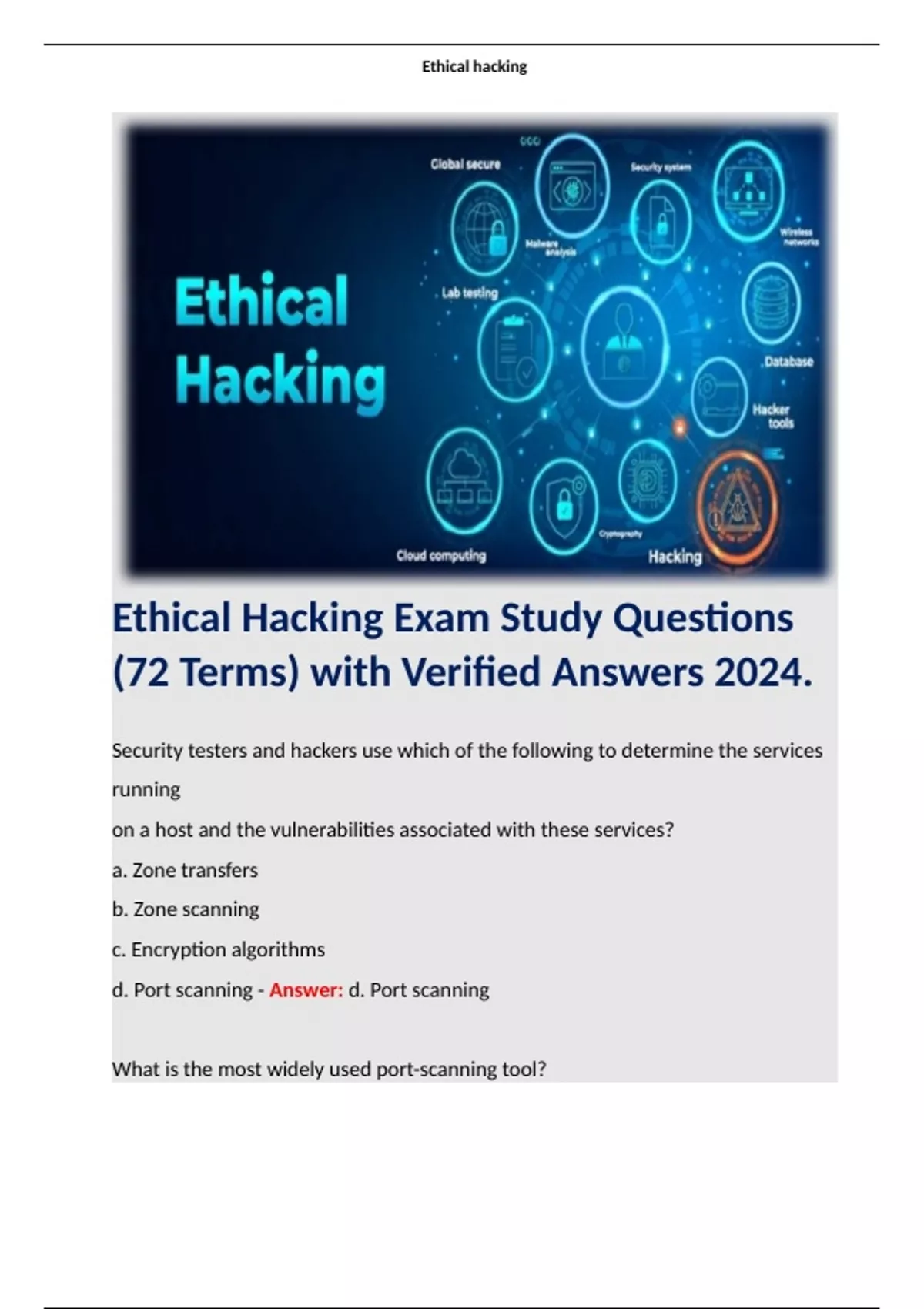 Ethical Hacking Exam Study Questions (72 Terms) with Verified Answers 2024. Terms like; Security testers and hackers use which of the following to determine the services running on a host and the vulnerabilities associated with these services? a. Zone transfers b. Zone scanning c. Encryption algorithms d. Port scanning - Answer: d. Port scanning