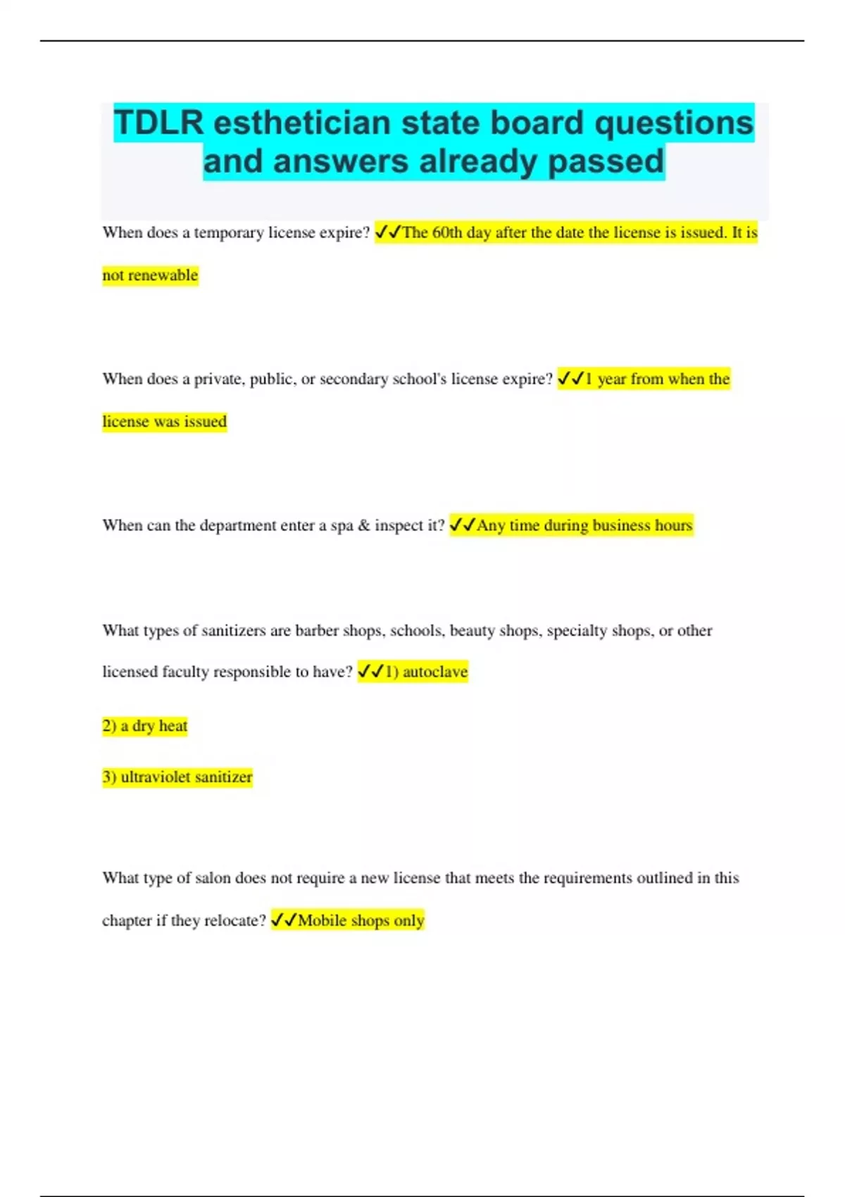 When does a temporary license expire? The 60th day after the date the license is issued. It is not renewable When does a private, public, or secondary school's license expire? 1 year from when the license was issued When can the department enter a spa & inspect it? Any time during business hours What types of sanitizers are barber shops, schools, beauty shops, specialty shops, or other licensed faculty responsible to have? 1) autoclave 2) a dry heat 3) ultraviolet sanitizer