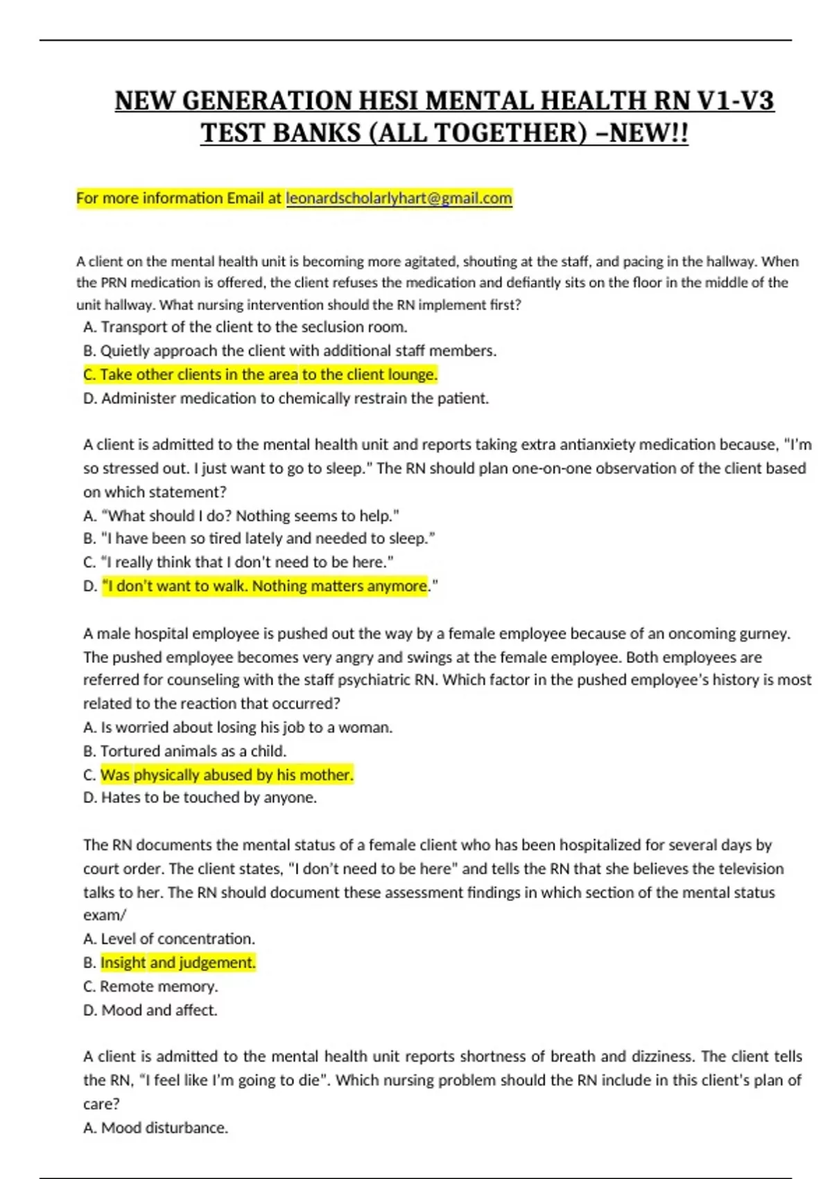 NEW GENERATION HESI MENTAL HEALTH RN V1-V3 TEST BANKS