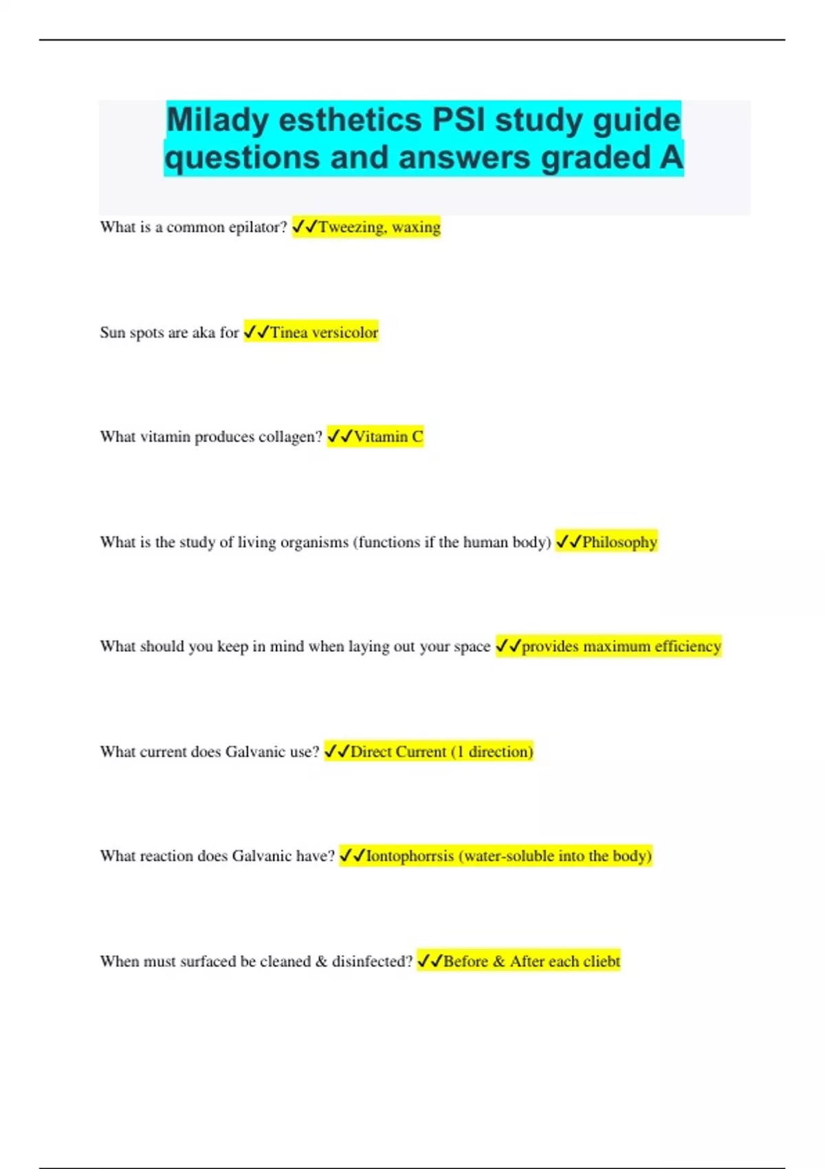 Milady esthetics PSI study guide questions and answers graded A+