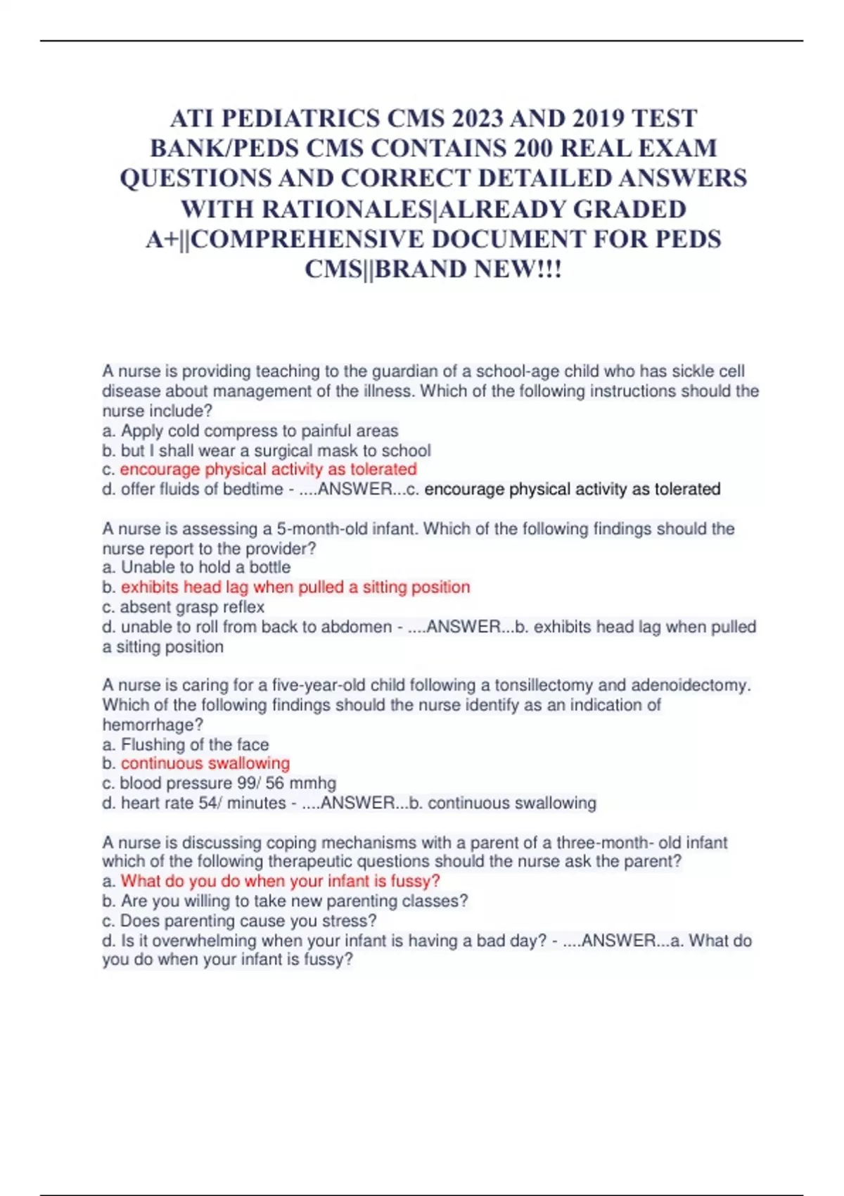 ATI PEDIATRICS CMS 2023 AND 2019 TEST BANK/PEDS CMS CONTAINS 200 REAL EXAM QUESTIONS AND CORRECT DETAILED ANSWERS WITH RATIONALES|ALREADY GRADED A+||COMPREHENSIVE DOCUMENT FOR PEDS CMS||BRAND NEW!!!