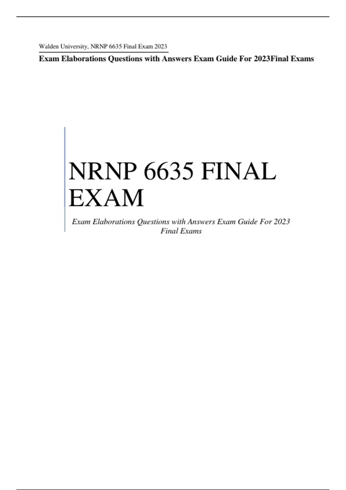 Walden University, NRNP 6635 Final Exam Elaborations Questions with Answers Exam Prep Guide For 2023 Final Exams Latest Verified Review 2023 Practice Questions and Answers for Exam Preparation, 100% Correct with Explanations, Highly Recommended, Download